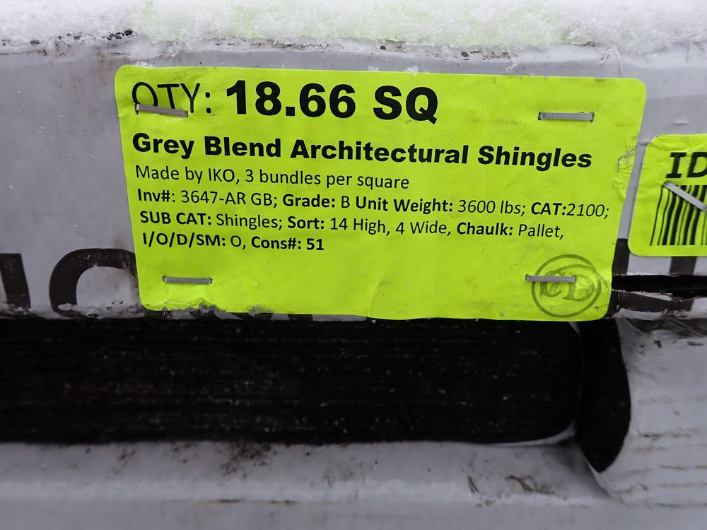 18.66 Grey Blend Architectural Shingles. Made By IKO, 3 Bundles Per Square, Grade: B *Any manufacturer warranties are NOT VALID with any purchase at our Auctions unless stated otherwise.. Weight: 3600. Sold by: Square. Sold as: Quantity x Price.
