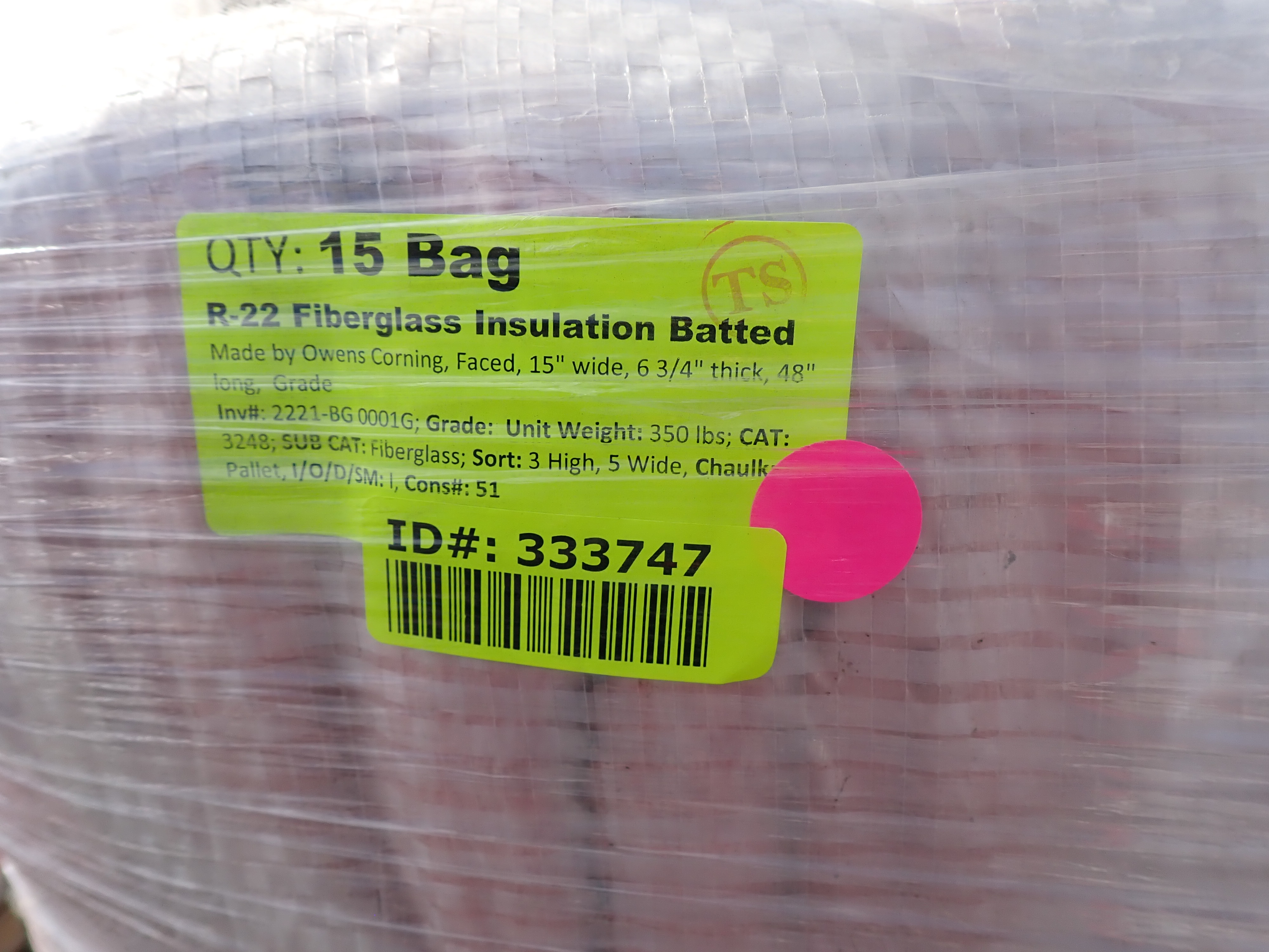 R-22 Fiberglass Insulation Batted. Made by Owens Corning, Faced, 15" wide, 6 3/4" thick, 48" long, Grade *Any manufacturer warranties are NOT VALID with any purchase at our Auctions unless stated otherwise.. Weight: 350 lbs.. Sold by: Bag. Sold as: Quantity x Price.