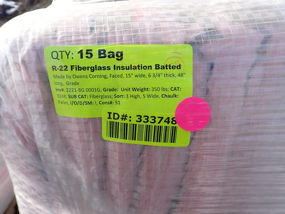 R-22 Fiberglass Insulation Batted. Made by Owens Corning, Faced, 15" wide, 6 3/4" thick, 48" long, Grade *Any manufacturer warranties are NOT VALID with any purchase at our Auctions unless stated otherwise.. Weight: 350 lbs.. Sold by: Bag. Sold as: Quantity x Price.