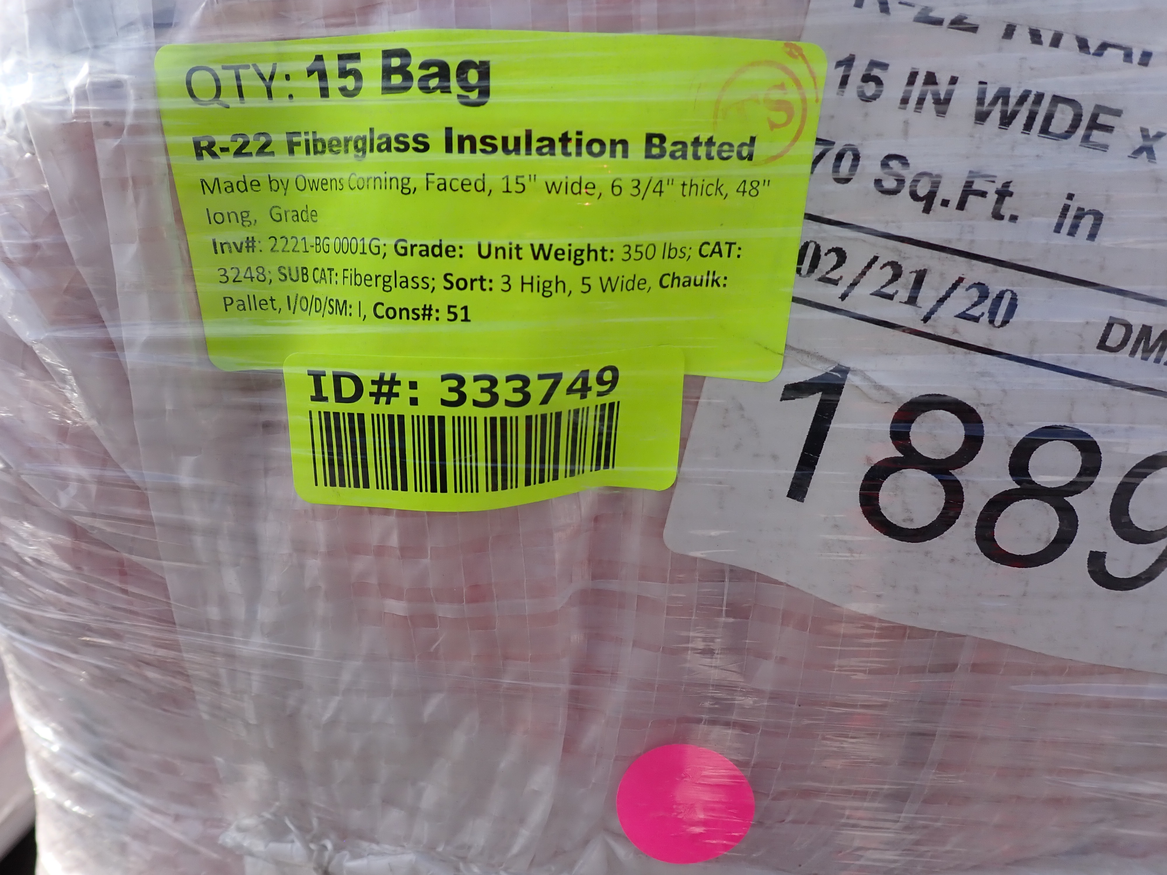 R-22 Fiberglass Insulation Batted. Made by Owens Corning, Faced, 15" wide, 6 3/4" thick, 48" long, Grade *Any manufacturer warranties are NOT VALID with any purchase at our Auctions unless stated otherwise.. Weight: 350 lbs.. Sold by: Bag. Sold as: Quantity x Price.