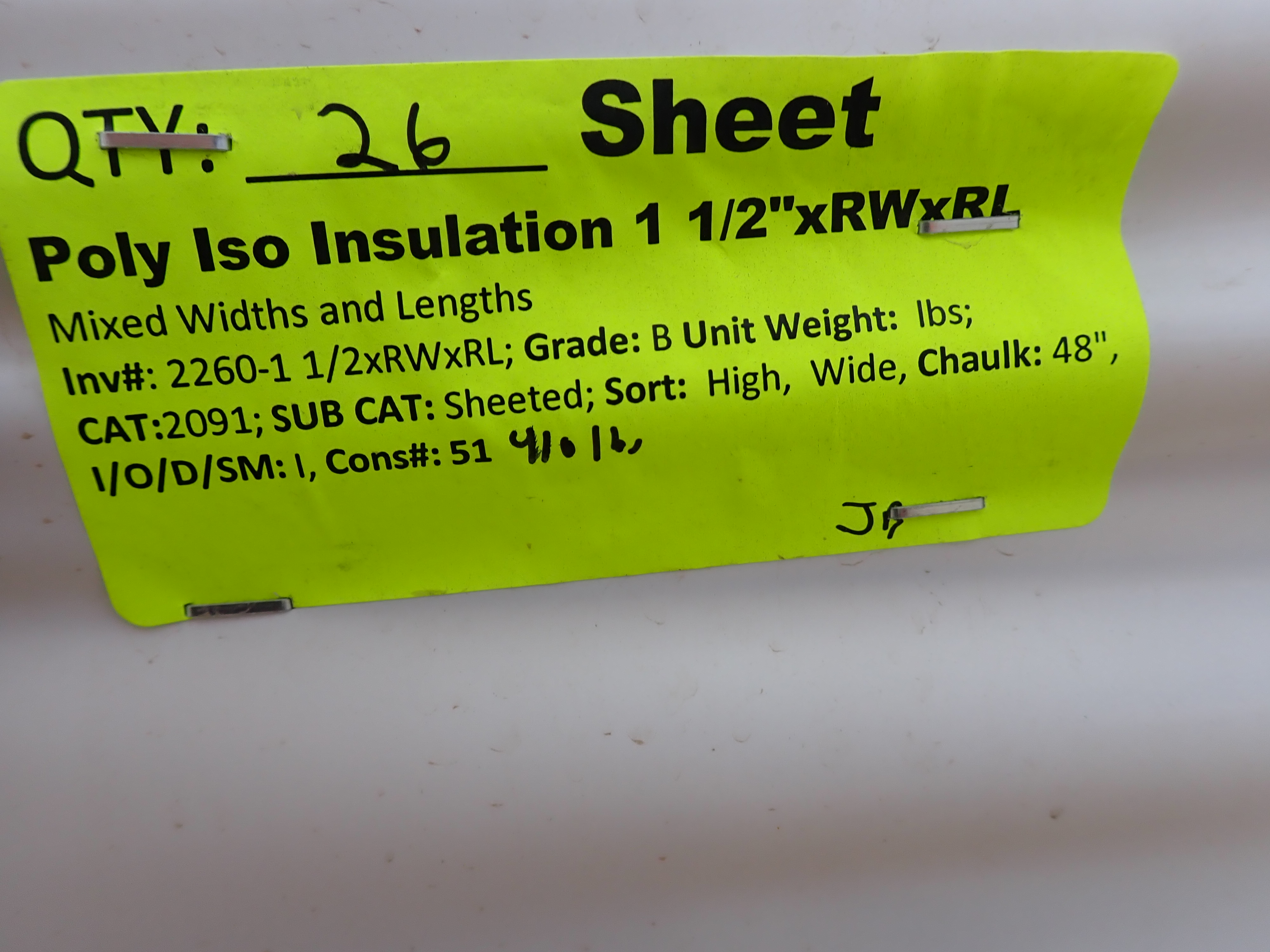 Poly Iso Insulation 1 1/2" x RW x RL. Mixed Widths, and Lengths. Grade: B. *Any manufacturer warranties are NOT VALID with any purchase at our Auctions unless stated otherwise.. Weight: 410. Sold by: Sheet. Sold as: Quantity x Price.
