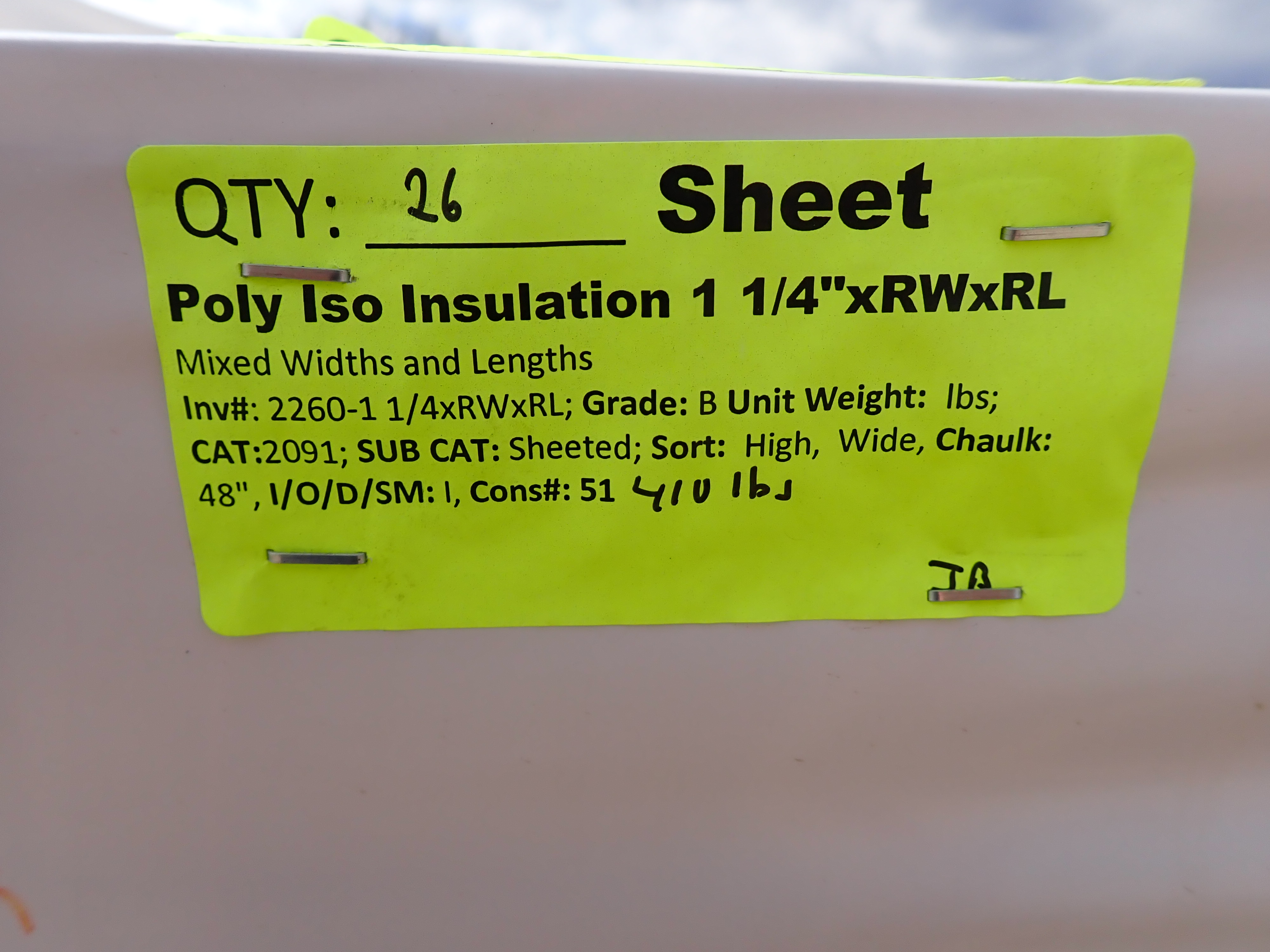 Poly Iso Insulation 1 1/4" x RW x RL. Mixed Widths, and Lengths. Grade: B. *Any manufacturer warranties are NOT VALID with any purchase at our Auctions unless stated otherwise.. Weight: 410. Sold by: Sheet. Sold as: Quantity x Price.