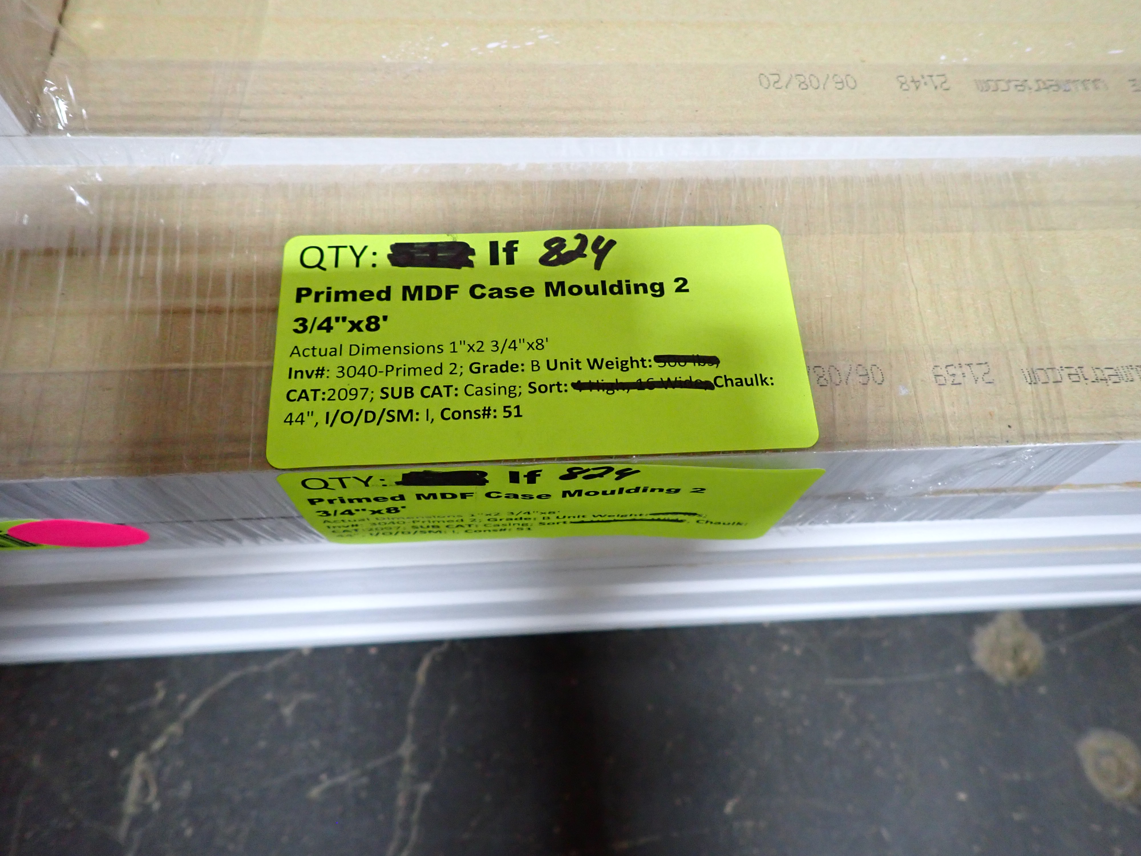 Primed MDF Case Molding 2 3/4" x 8'. 103 Pcs, Grade: B, Actual Dimensions: 1" x 2 3/4" x 8' *Any manufacturer warranties are NOT VALID with any purchase at our Auctions unless stated otherwise.. Weight: X. Sold by: Linear Foot. Sold as: Quantity x Price.