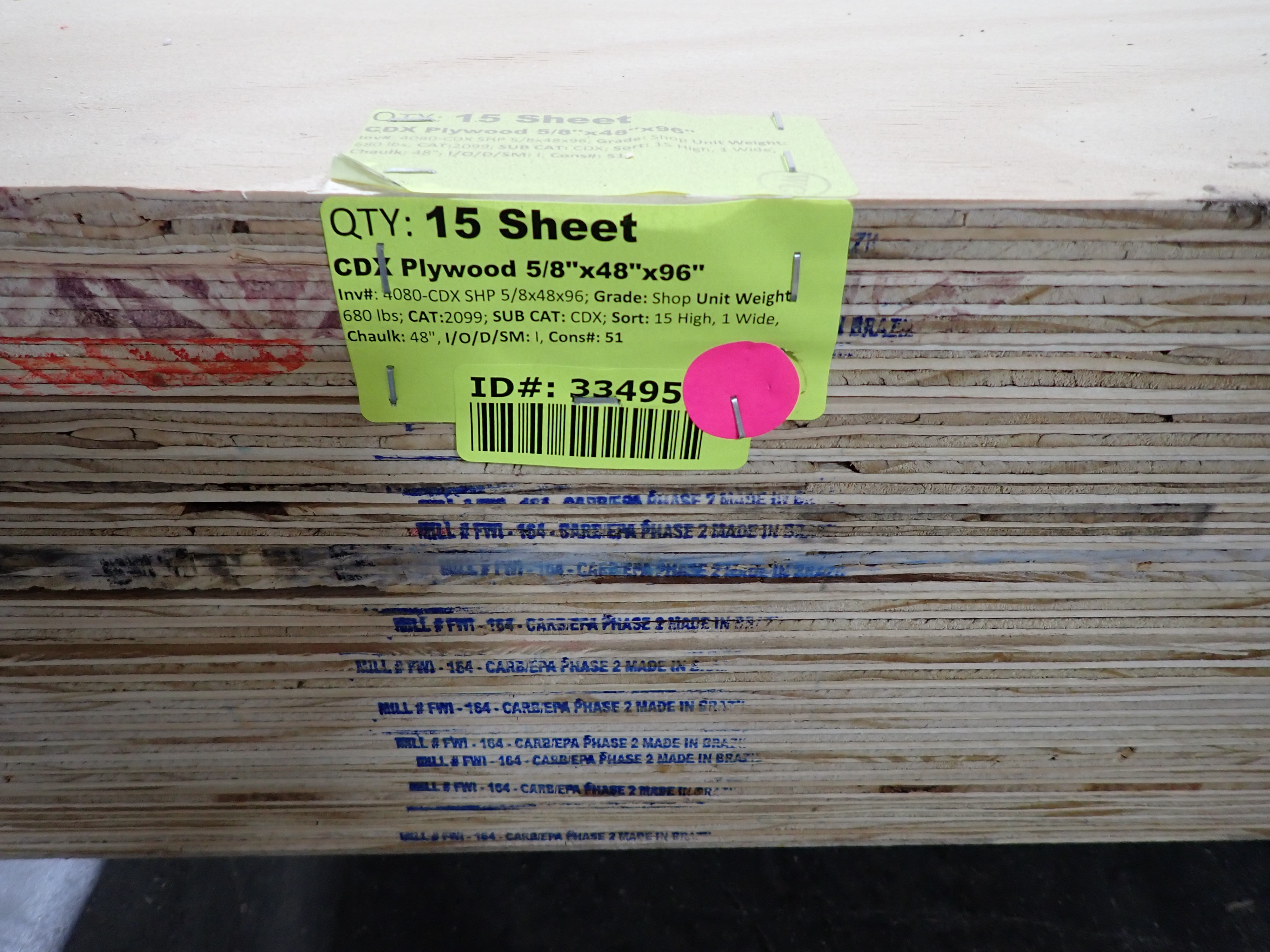CDX Plywood 5/8"x48"x96". Grade: Shop *Any manufacturer warranties are NOT VALID with any purchase at our Auctions unless stated otherwise.. Weight: 680 lbs.. Sold by: Sheet. Sold as: Quantity x Price.
