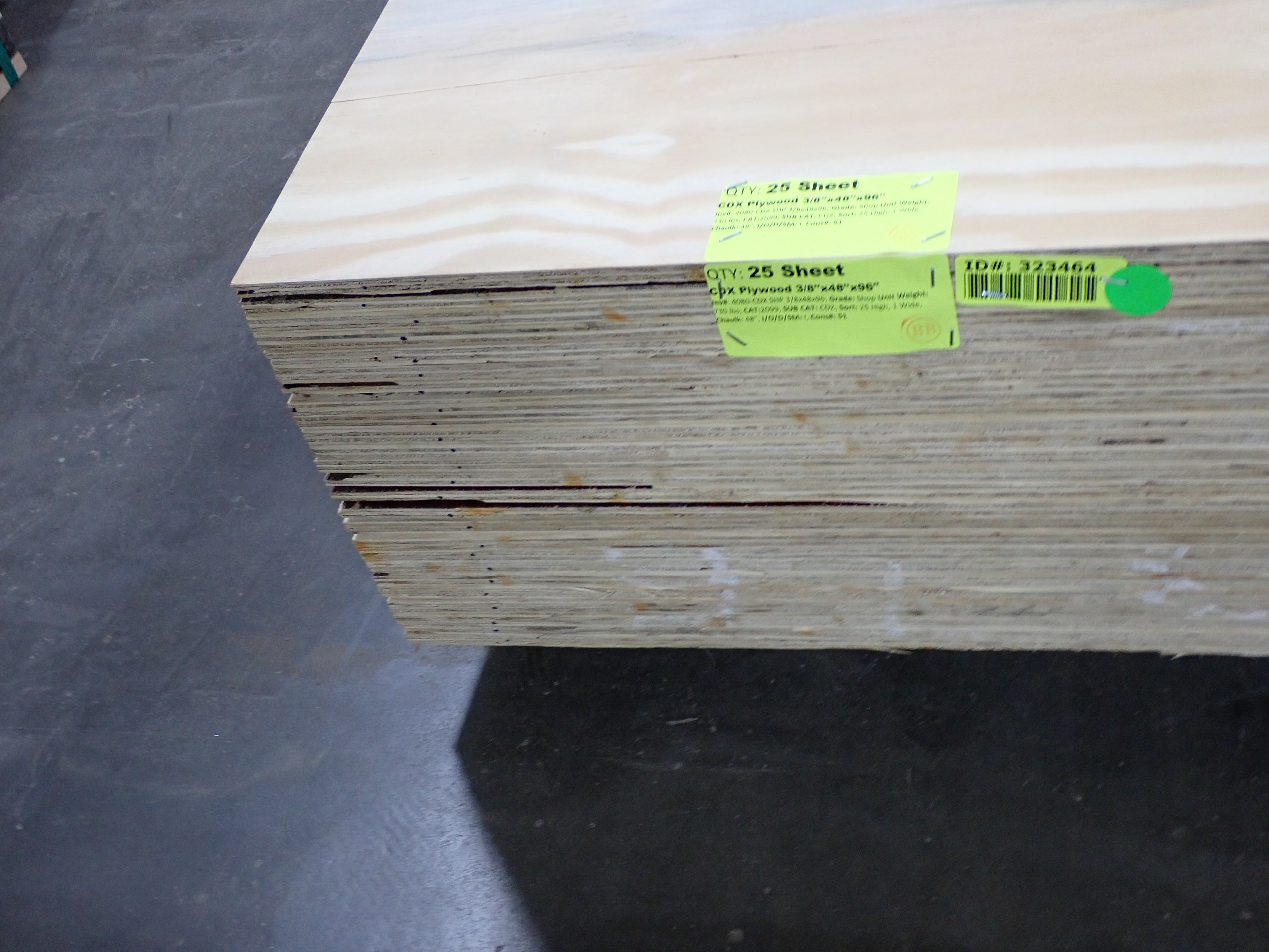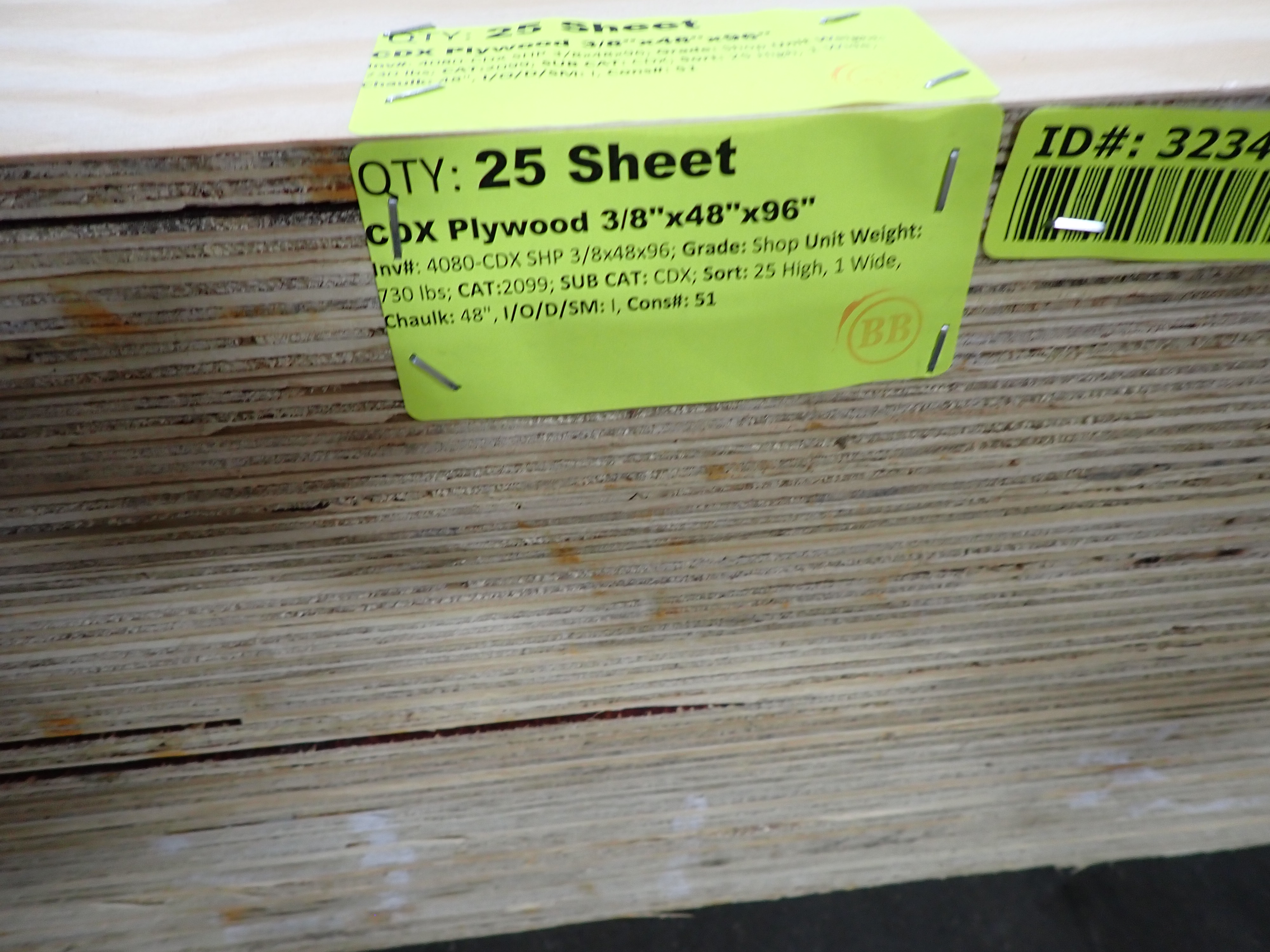 CDX Plywood 3/8" x 48" x 96". Grade: Shop *Any manufacturer warranties are NOT VALID with any purchase at our Auctions unless stated otherwise.. Weight: 730. Sold by: Sheet. Sold as: Quantity x Price.