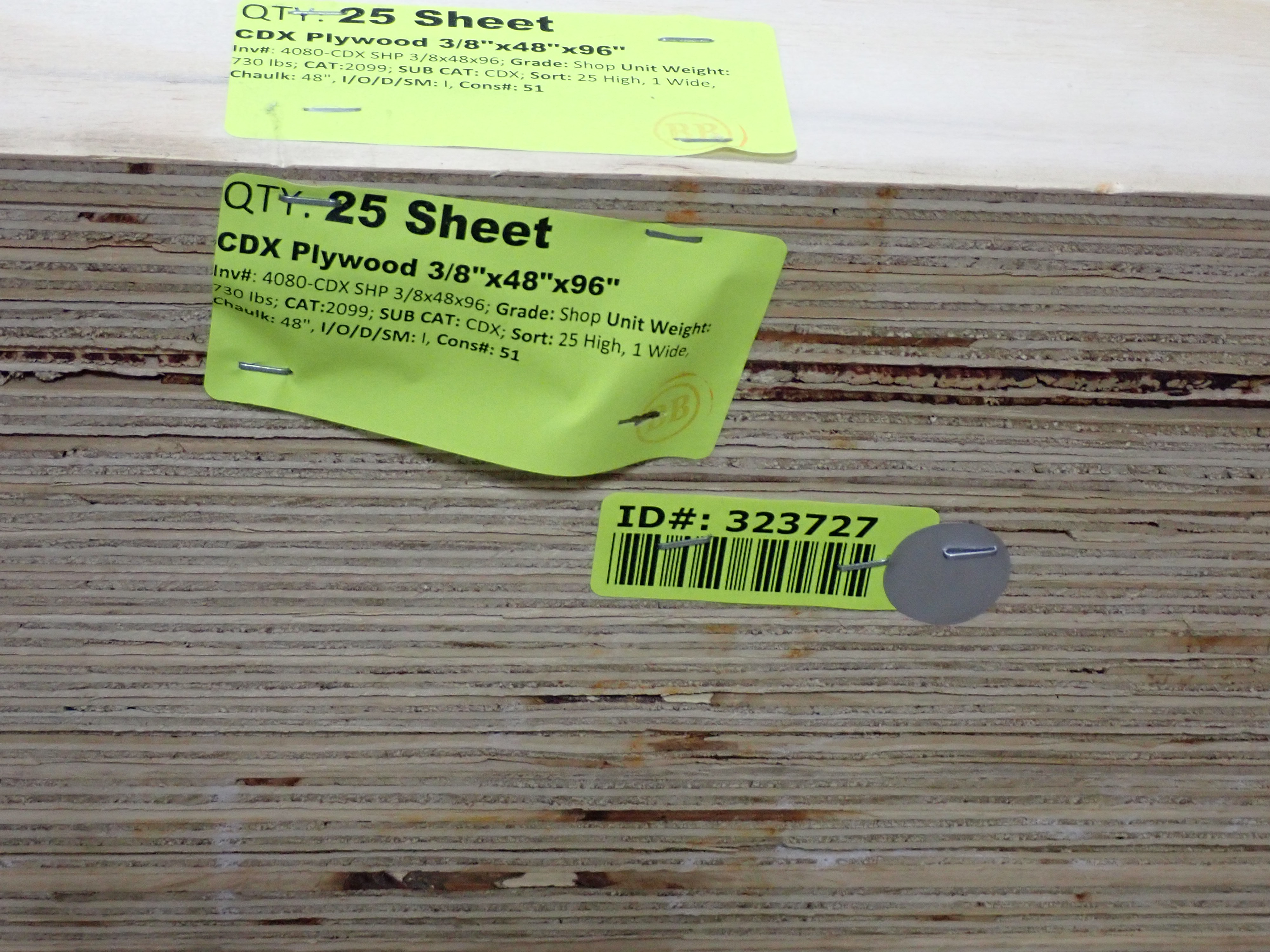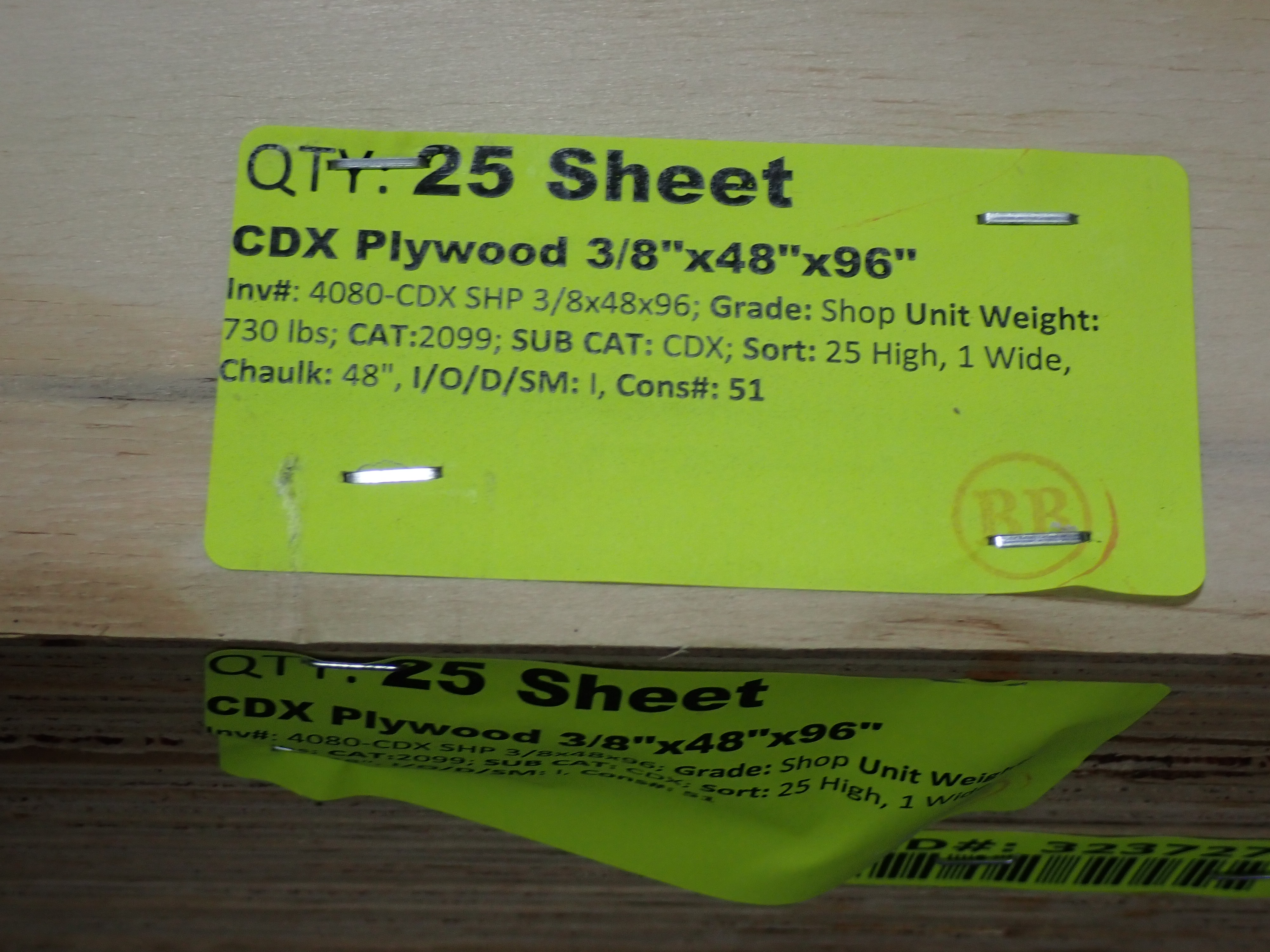 CDX Plywood 3/8" x 48" x 96". Grade: Shop *Any manufacturer warranties are NOT VALID with any purchase at our Auctions unless stated otherwise.. Weight: 730. Sold by: Sheet. Sold as: Quantity x Price.
