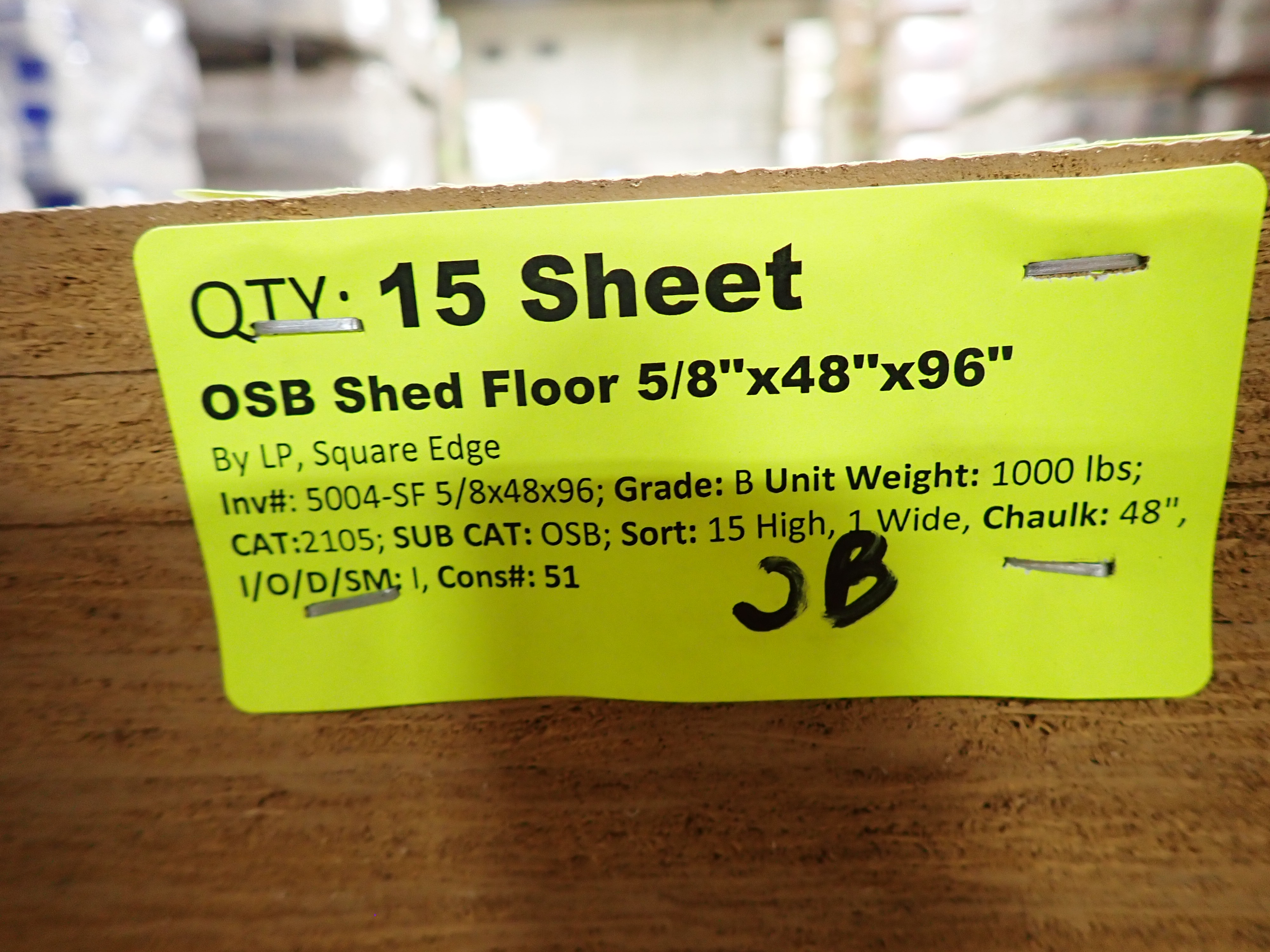 OSB Shed Floor 5/8" x 48" x 96". By: LP, Square Edge. Grade: B *Any manufacturer warranties are NOT VALID with any purchase at our Auctions unless stated otherwise.. Weight: 1000. Sold by: Sheet. Sold as: Quantity x Price.