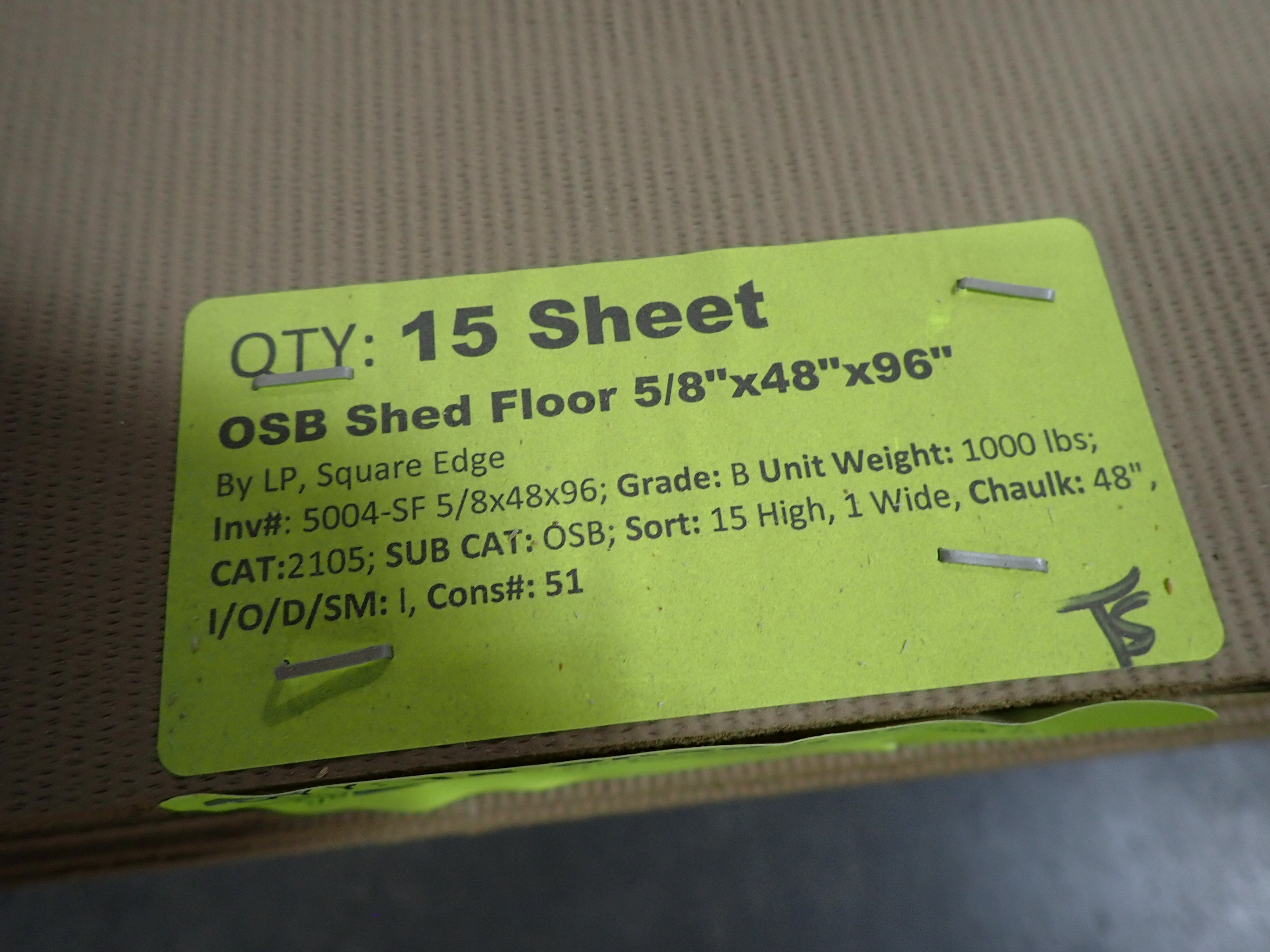OSB Shed Floor 5/8" x 48" x 96". By: LP, Square Edge. Grade: B *Any manufacturer warranties are NOT VALID with any purchase at our Auctions unless stated otherwise.. Weight: 1000. Sold by: Sheet. Sold as: Quantity x Price.
