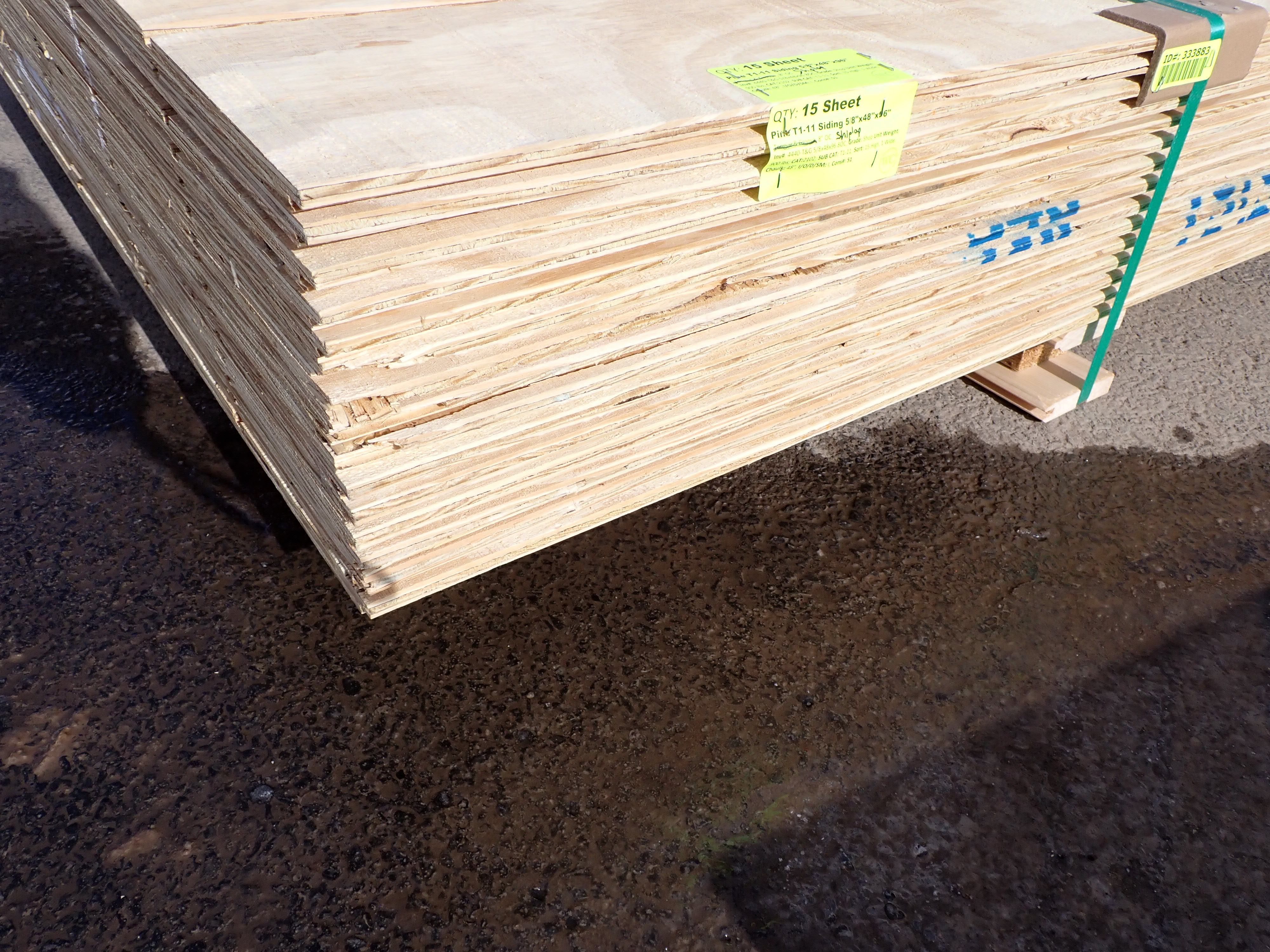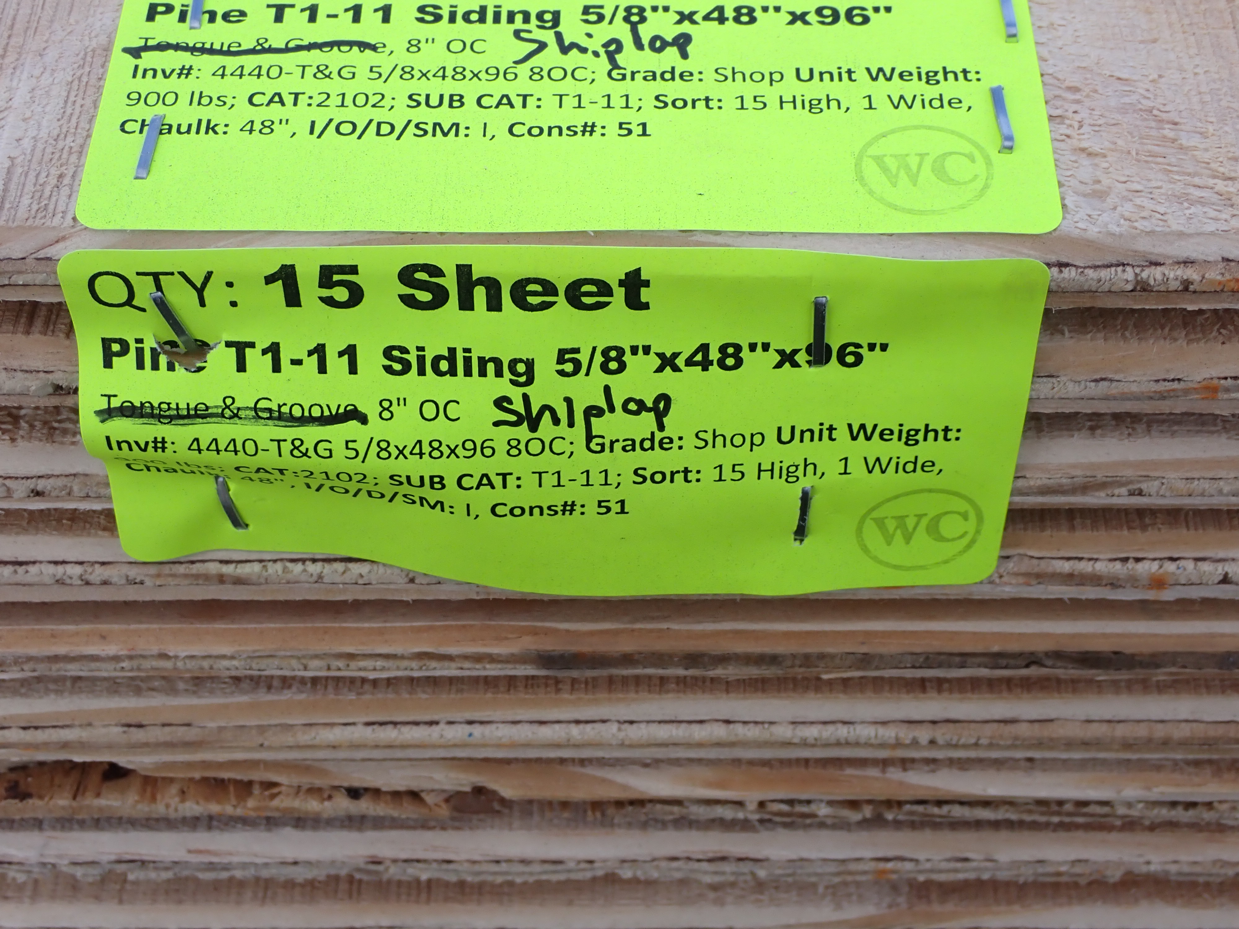 Pine T1- 11 Siding 5/8" x 48" x 96". Shiplap, 8" OC, Grade: Shop. *Any manufacturer warranties are NOT VALID with any purchase at our Auctions unless stated otherwise.. Weight: 900. Sold by: Sheet. Sold as: Quantity x Price.