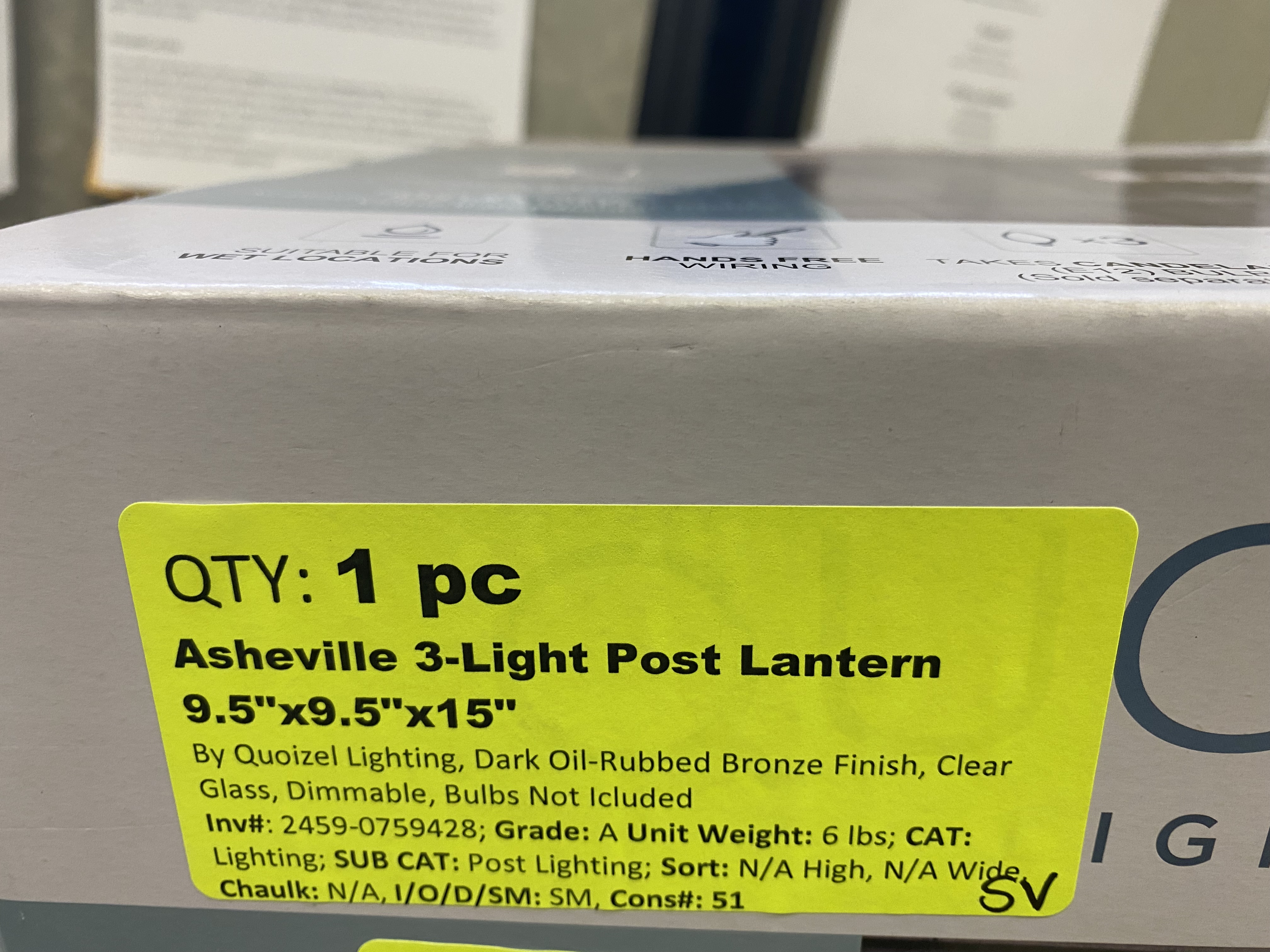 Asheville 3-Light Post Lantern 9.5" x 9.5" x 15". Quoizel Lighting, Dark Oil-Rubbed Bronze Finish, Clear Glass, Dimmable, Bulbs Not Included; Grade A *Any manufacturer warranties are NOT VALID with any purchase at our Auctions unless stated otherwise.. Weight: 6. Sold by: Piece. Sold as: Quantity x Price.