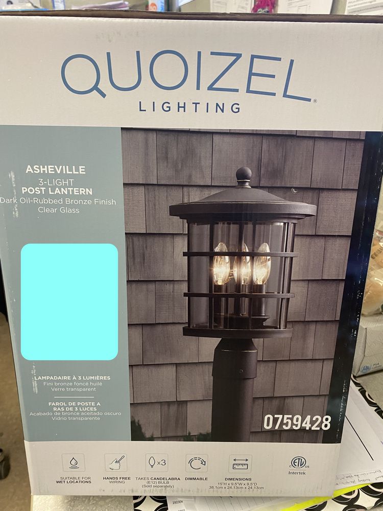 Asheville 3-Light Post Lantern 9.5" x 9.5" x 15". Quoizel Lighting, Dark Oil-Rubbed Bronze Finish, Clear Glass, Dimmable, Bulbs Not Included; Grade A *Any manufacturer warranties are NOT VALID with any purchase at our Auctions unless stated otherwise.. Weight: 6. Sold by: Piece. Sold as: Quantity x Price.