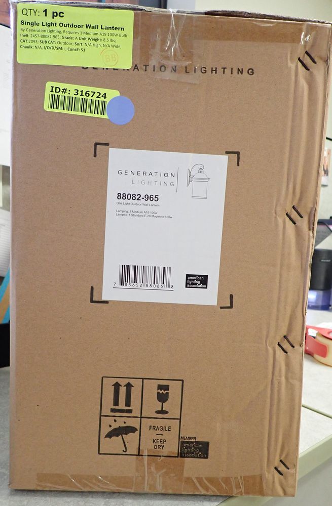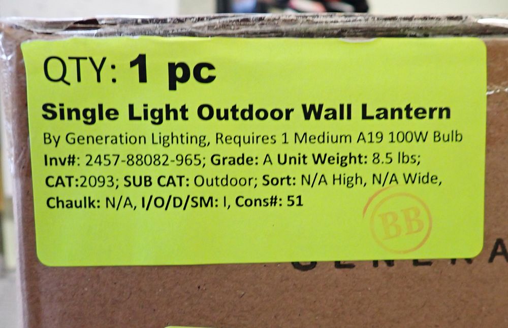 Single Light Outdoor Wall Lantern. Generation Lighting, Requires 1 Medium A19 100W Bulb; Grade A *Any manufacturer warranties are NOT VALID with any purchase at our Auctions unless stated otherwise.. Weight: 8.5. Sold by: Piece. Sold as: Quantity x Price.