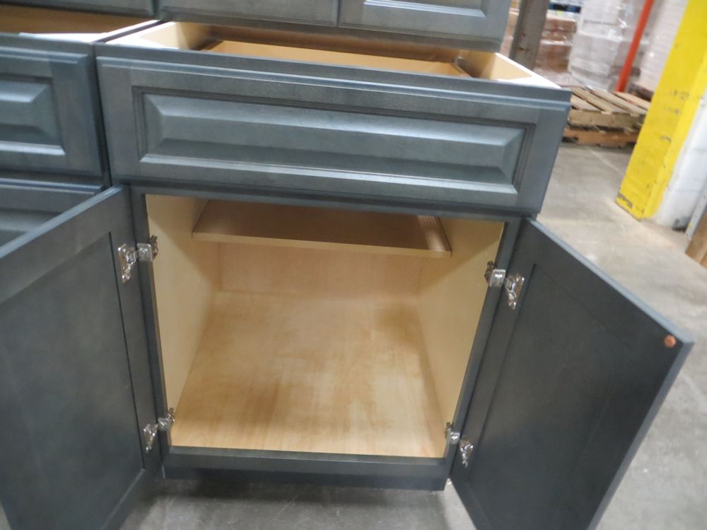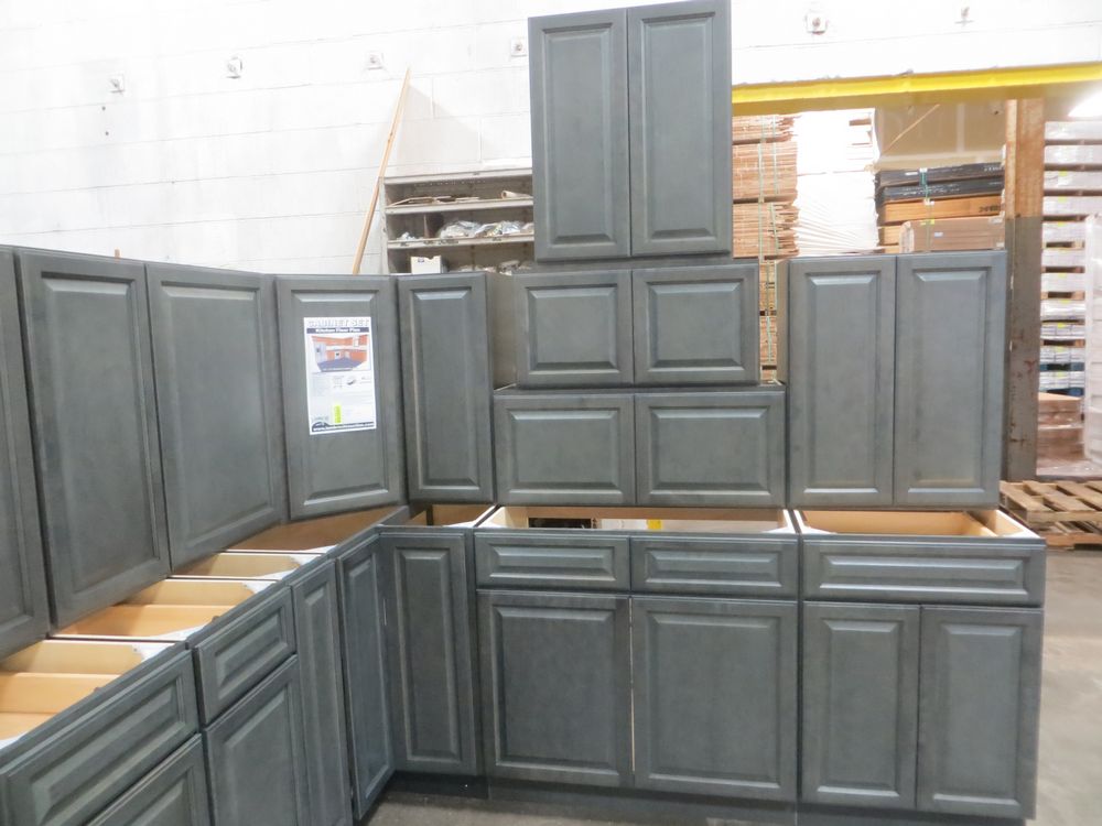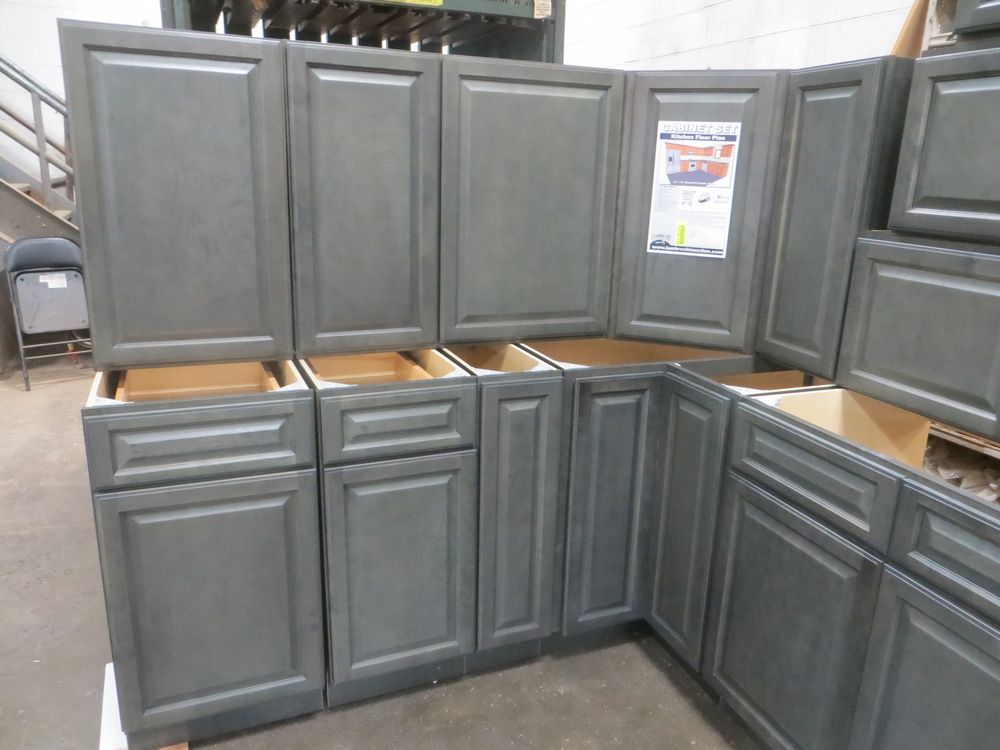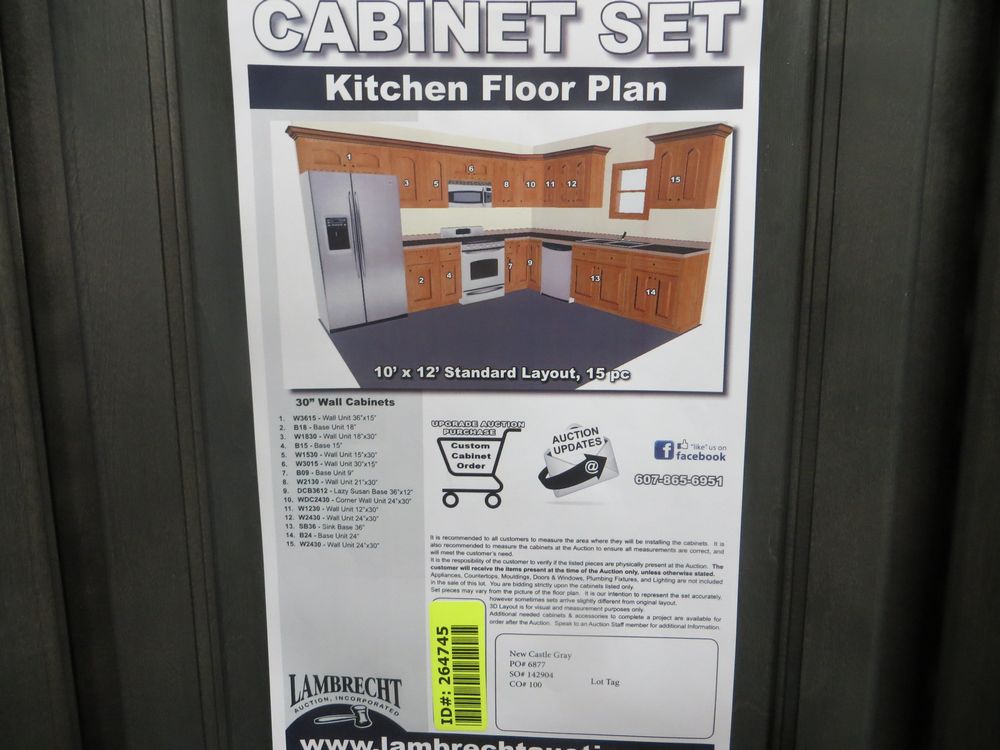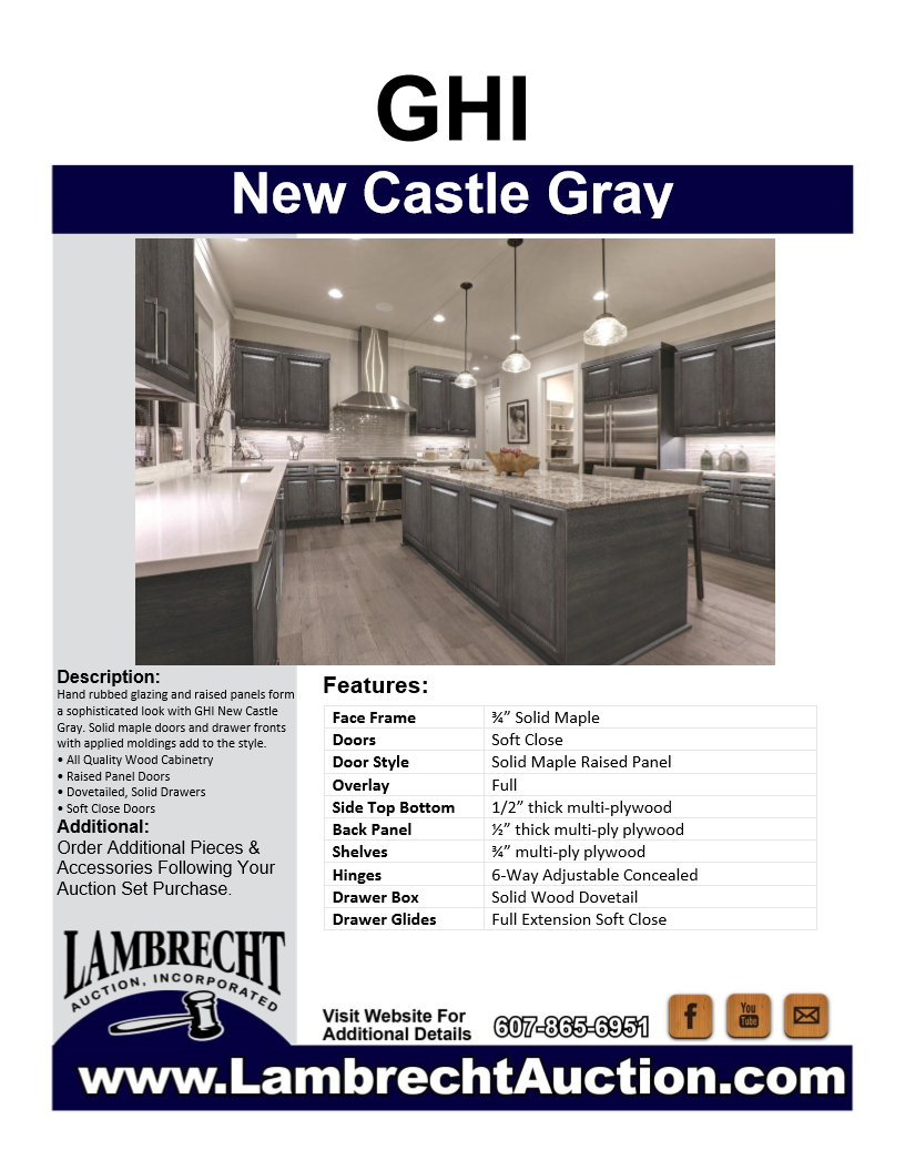 New Castle Gray Kitchen Cabinet Set 10'x12'. Standard Layout. 30" Walls. ASSEMBLY OPTION IS NOT AVAILABLE FOR THIS SET. By GHI. 3/4” Solid Maple Face Frame -Solid Maple Raised Panel Doors and Drawer Fronts -1/2” Plywood Box Construction with Wood Veneer Interiors and Exteriors -3/4” plywood Shelves -Full overlay Doors and Drawer Fronts -Solid Wood Dovetail Drawer Box -Soft Close Full Extension Drawer Gliders -Hand Rubbed Glaze -6-Way Adjustable Concealed Hinges -Soft Close. Enclosed in each cabinet set will be a Build Sheet which lists the individual cabinets in each set. As the cabinets are palletized each cabinet will be checked off and signed by our staff member to ensure that the set is complete at the time of pick-up. Please keep this Build Sheet on hand because it will be required if there is an issue with your cabinet set. Cabinet issues will not be addressed without this build sheet. *Any manufacturer warranties are NOT VALID with any purchase at our Auctions unless stated otherwise.. Weight: x. Sold by: Set. Sold as: Quantity x Price.