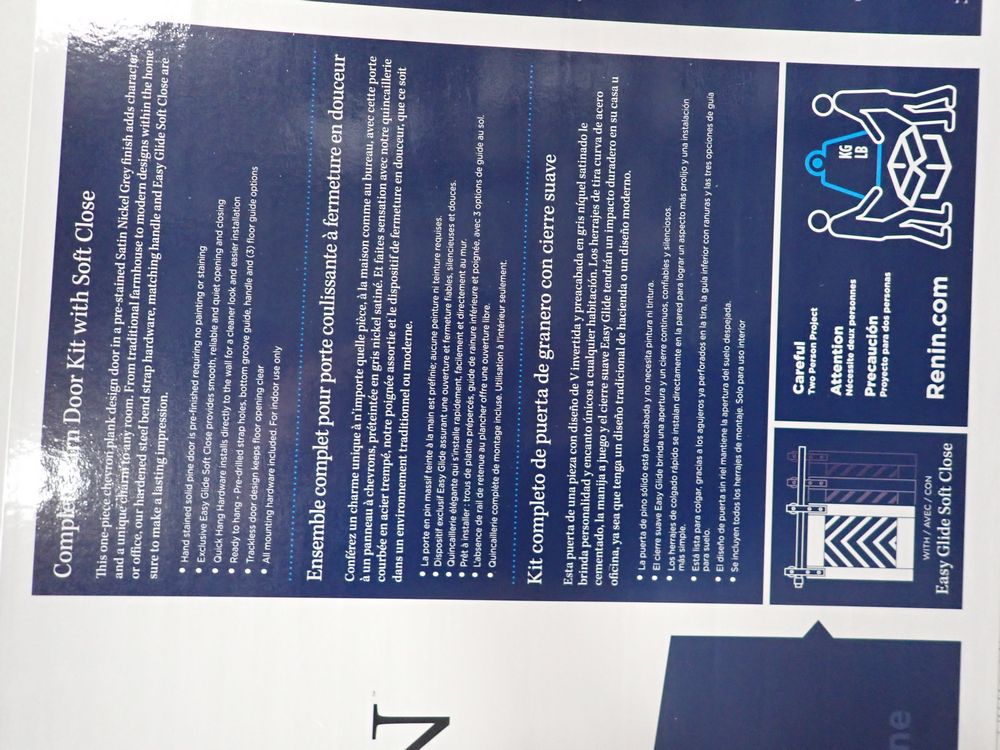 Nickel Herringbone Rustic Barn Door. Hardware Kit & Soft, Close Mechanism 36" x 84" Included. Grade: 1st *Any manufacturer warranties are NOT VALID with any purchase at our Auctions unless stated otherwise.. Weight: 73. Sold by: Door. Sold as: Quantity x Price.
