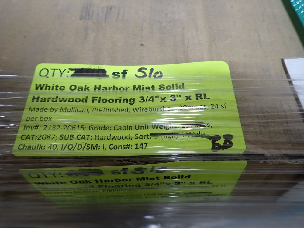 White Oak Harbor Mist Solid Hardwood Flooring 3/4" x 3" x RL. Made By Mullican, Prefinished, Wirebrushed, 20 Boxes, 24 sf Per Box, Grade: Cabin *Any manufacturer warranties are NOT VALID with any purchase at our Auctions unless stated otherwise.. Weight: X. Sold by: Square Foot. Sold as: Quantity x Price.