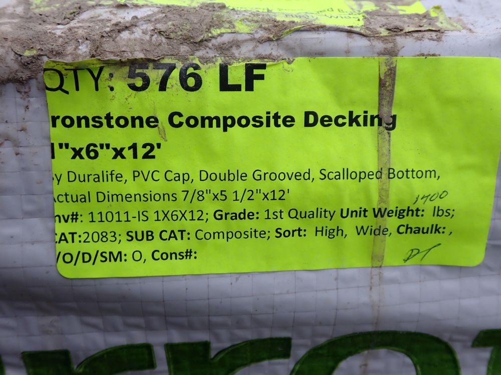 Ironstone Composite Decking 1" x 6" x 12'. By Duralife, PVC Cap, Double Grooved, Scalloped Bottom, Actual Dimensions 7/8" x 5 1/2" x 12'. There are 48 boards in this lot. Grade 1st Quality. *Any manufacturer warranties are NOT VALID with any purchase at our Auctions unless stated otherwise.. Weight: 1400. Sold by: Linear Foot. Sold as: Quantity x Price.