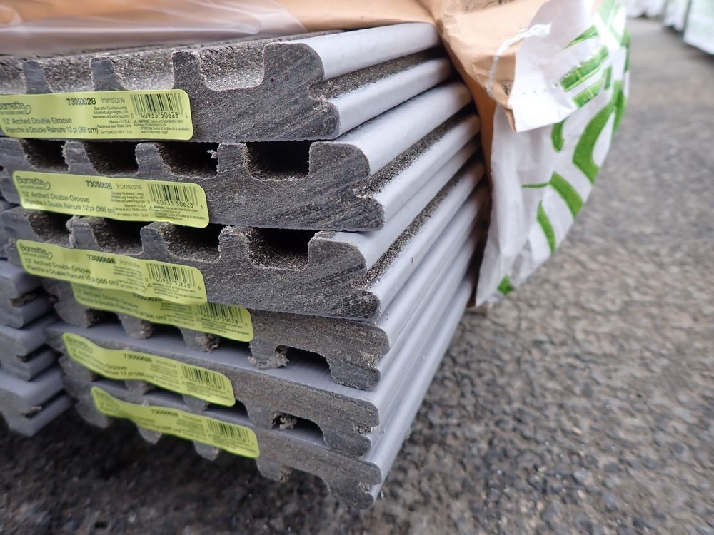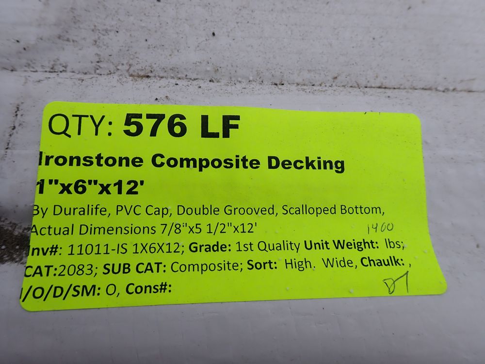 Ironstone Composite Decking 1" x 6" x 12'. By Duralife, PVC Cap, Double Grooved, Scalloped Bottom, Actual Dimensions 7/8" x 5 1/2" x 12'. There are 48 boards in this lot. Grade 1st Quality. *Any manufacturer warranties are NOT VALID with any purchase at our Auctions unless stated otherwise.. Weight: 1400. Sold by: Linear Foot. Sold as: Quantity x Price.