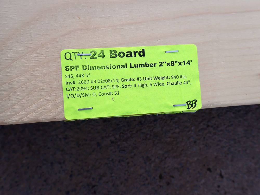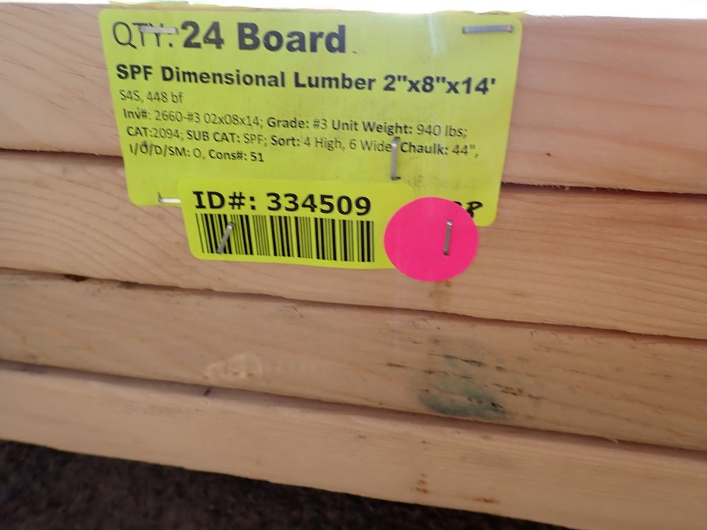 SPF Dimensional Lumber 2" x 8" x 14'. S4S 448 bf, Grade: #3 *Any manufacturer warranties are NOT VALID with any purchase at our Auctions unless stated otherwise.. Weight: 940. Sold by: Board. Sold as: Quantity x Price.