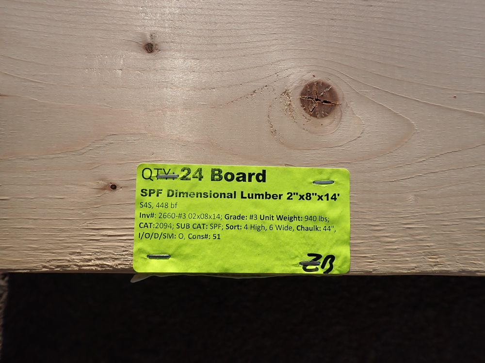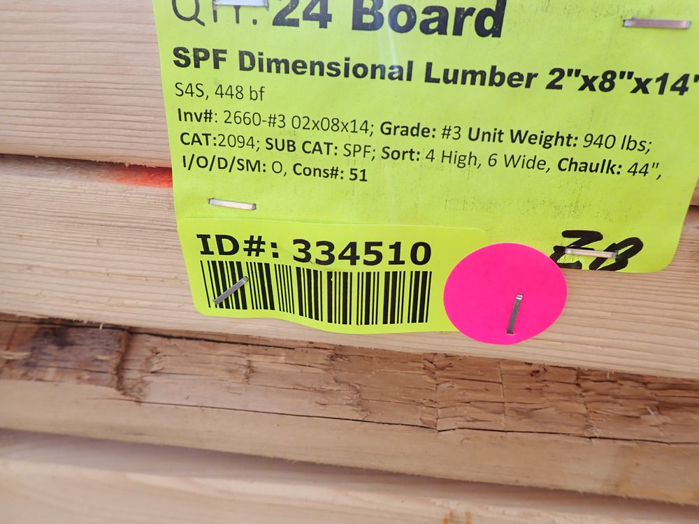 SPF Dimensional Lumber 2" x 8" x 14'. S4S 448 bf, Grade: #3 *Any manufacturer warranties are NOT VALID with any purchase at our Auctions unless stated otherwise.. Weight: 940. Sold by: Board. Sold as: Quantity x Price.