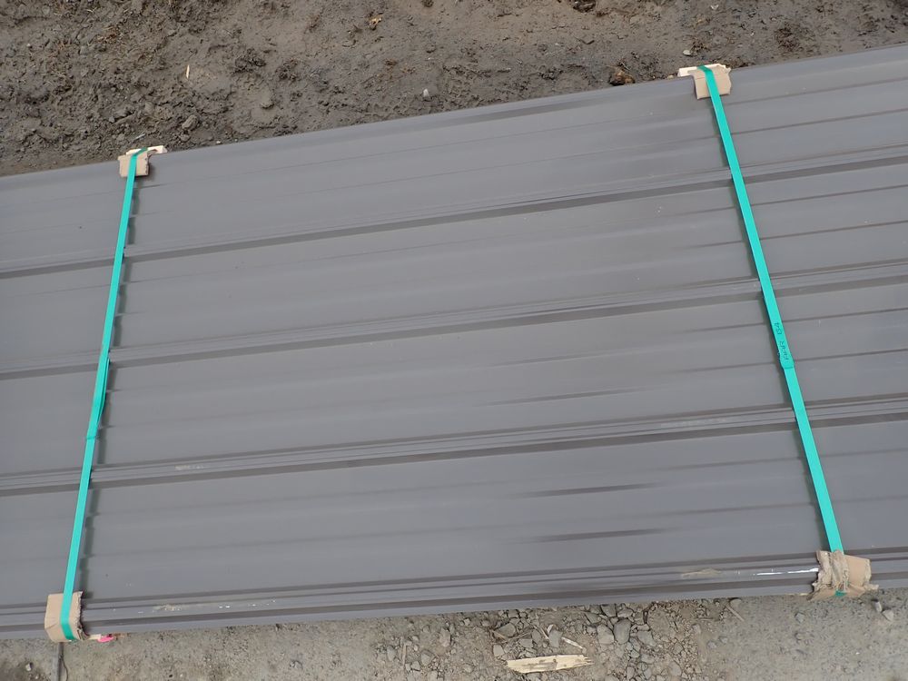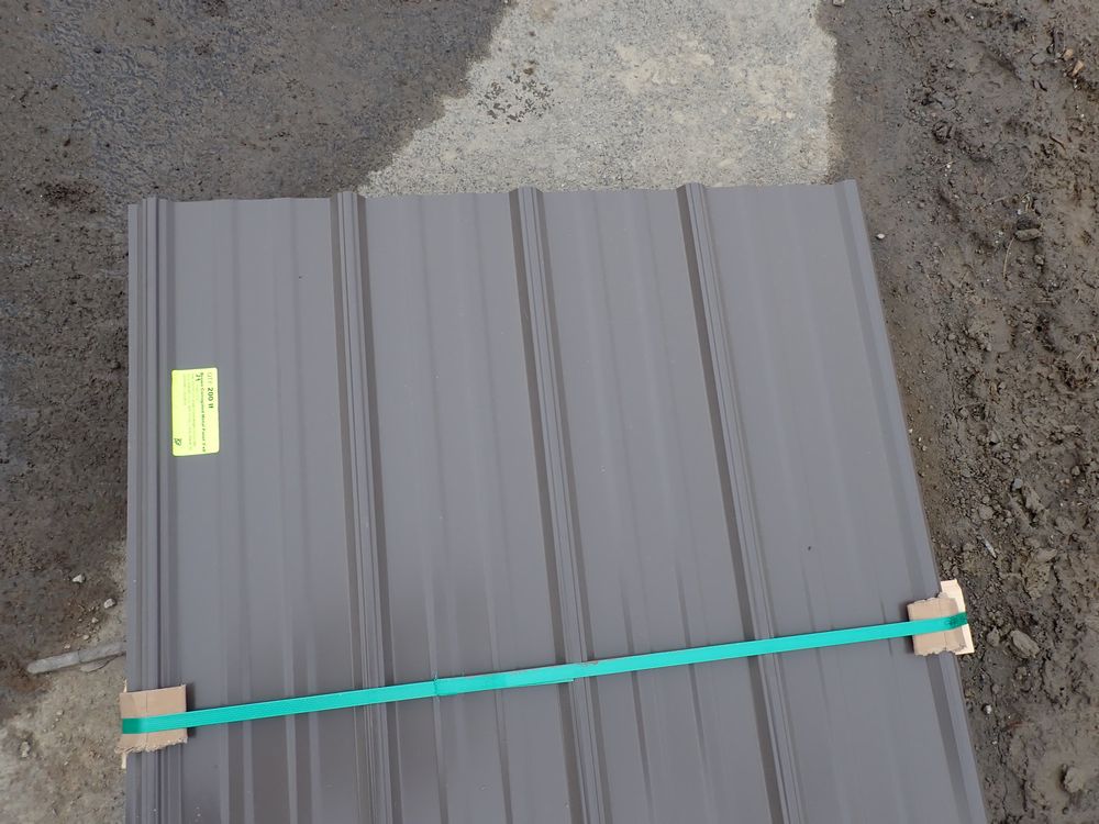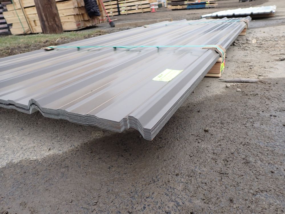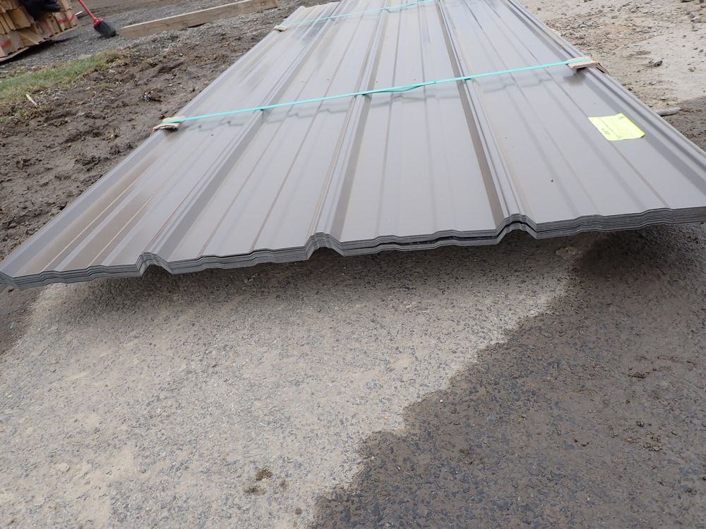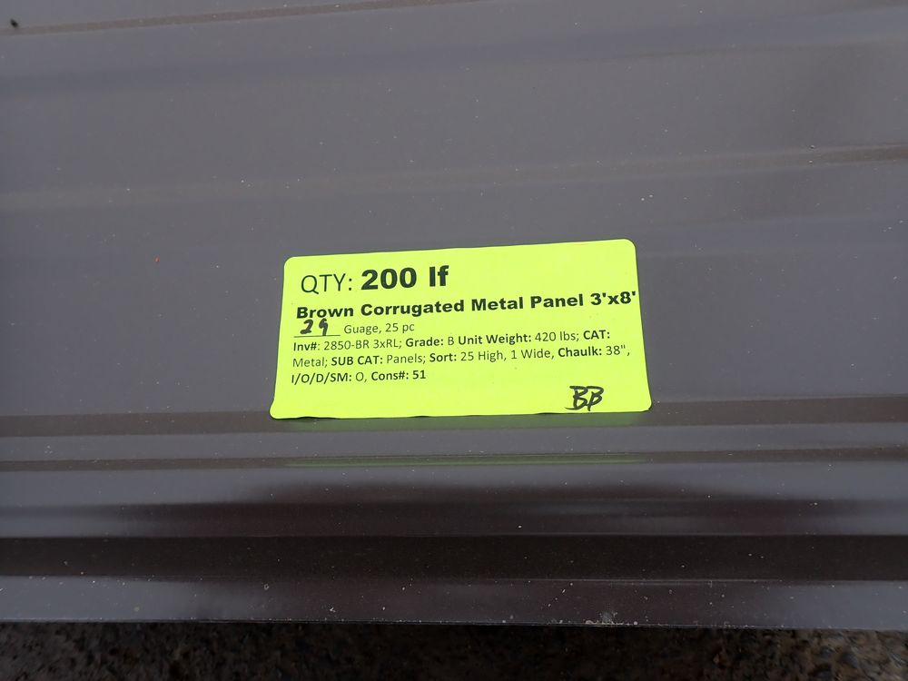 Brown Corrugated Metal Panel 3'x8'. 29 Guage, 25 Piece. Grade: B *Any manufacturer warranties are NOT VALID with any purchase at our Auctions unless stated otherwise.. Weight: 420 lbs.. Sold by: Linear Foot. Sold as: Quantity x Price.