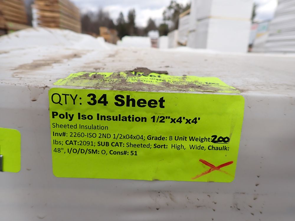 Poly Iso Insulation 1/2" x 4' x 4'. Sheeted Insulation. Grade: B. *Any manufacturer warranties are NOT VALID with any purchase at our Auctions unless stated otherwise.. Weight: 200. Sold by: Sheet. Sold as: Quantity x Price.