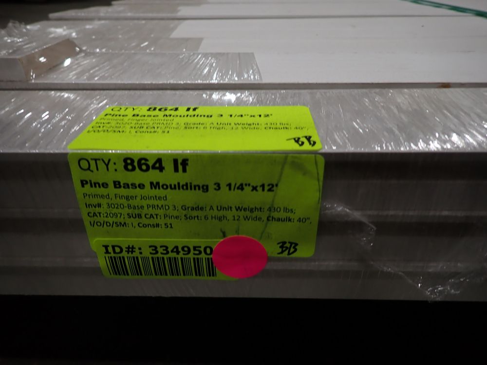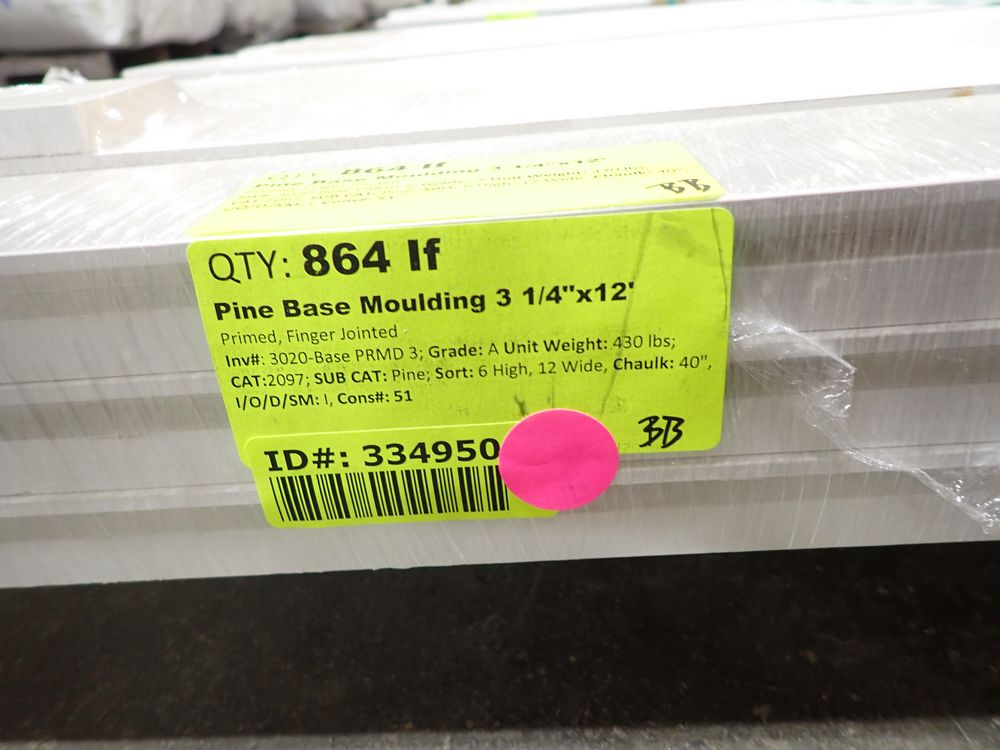 Pine BaseMoulding 3 1/4"x12'. Primed, Finger Jointed. Grade: A. 72 Pieces. *Any manufacturer warranties are NOT VALID with any purchase at our Auctions unless stated otherwise.. Weight: 430 lbs.. Sold by: Linear Foot. Sold as: Quantity x Price.