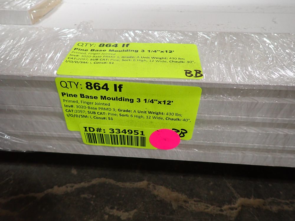 Pine BaseMoulding 3 1/4"x12'. Primed, Finger Jointed. Grade: A. 72 Pieces. *Any manufacturer warranties are NOT VALID with any purchase at our Auctions unless stated otherwise.. Weight: 430 lbs.. Sold by: Linear Foot. Sold as: Quantity x Price.