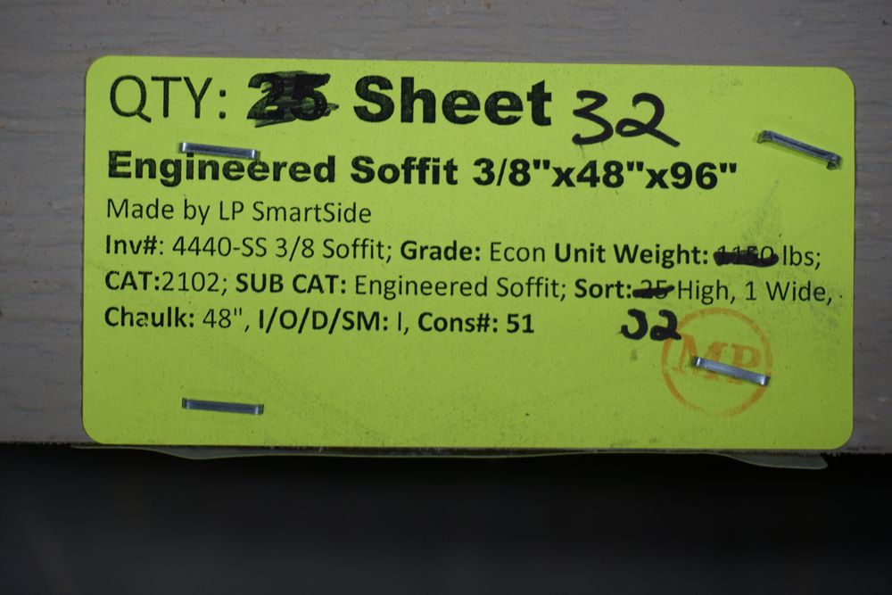 Engineered Soffit, 3/8" x 48" x 96". Made By LP SmartSide. Grade: A. *Any manufacturer warranties are NOT VALID with any purchase at our Auctions unless stated otherwise.. Weight: 1175. Sold by: Sheet. Sold as: Quantity x Price.