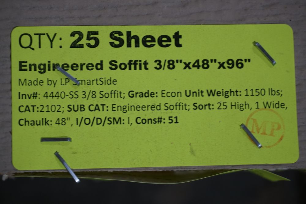Engineered Soffit, 3/8" x 48" x 96". Made By LP SmartSide. Grade: A. *Any manufacturer warranties are NOT VALID with any purchase at our Auctions unless stated otherwise.. Weight: 1175. Sold by: Sheet. Sold as: Quantity x Price.