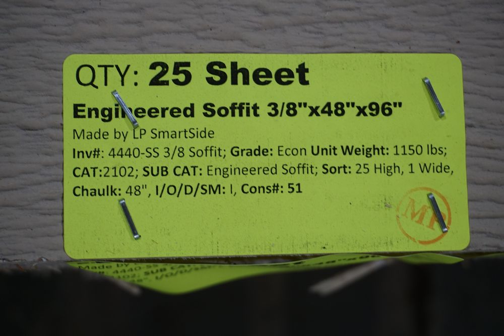 Engineered Soffit, 3/8" x 48" x 96". Made By LP SmartSide. Grade: A. *Any manufacturer warranties are NOT VALID with any purchase at our Auctions unless stated otherwise.. Weight: 1175. Sold by: Sheet. Sold as: Quantity x Price.
