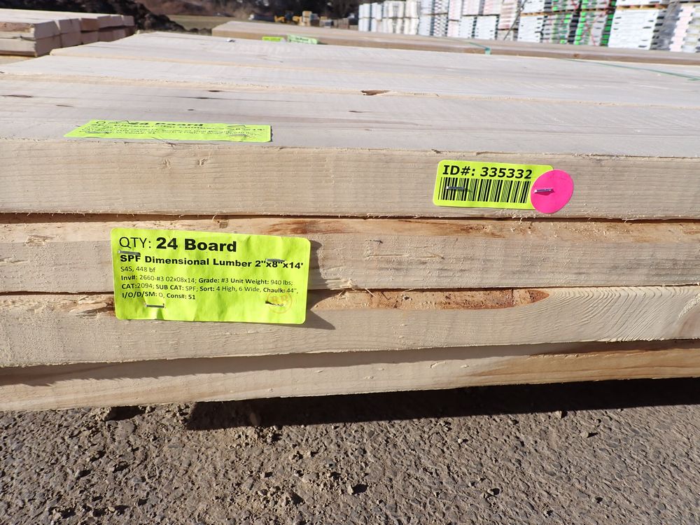 SPF Dimensional Lumber 2" x 8" x 14'. S4S, 448 bf. Grade: #3 *Any manufacturer warranties are NOT VALID with any purchase at our Auctions unless stated otherwise.. Weight: 940. Sold by: Board. Sold as: Quantity x Price.