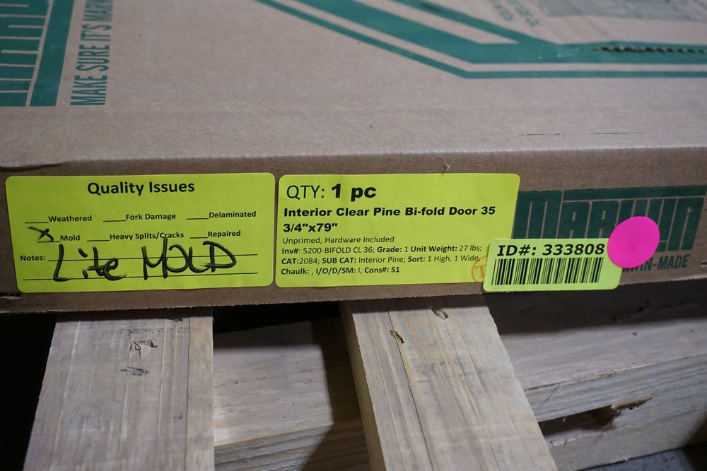 Interior Clear Pine Bi-Fold Door 35 3/4"x79" *See Description*. Unprimed, Hardware included. Grade: 1 *Light Mold* *Any manufacturer warranties are NOT VALID with any purchase at our Auctions unless stated otherwise.. Weight: 27 lbs.. Sold by: Door. Sold as: Quantity x Price.