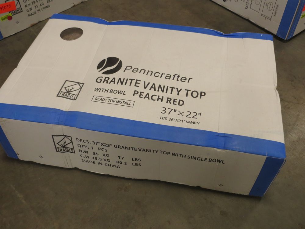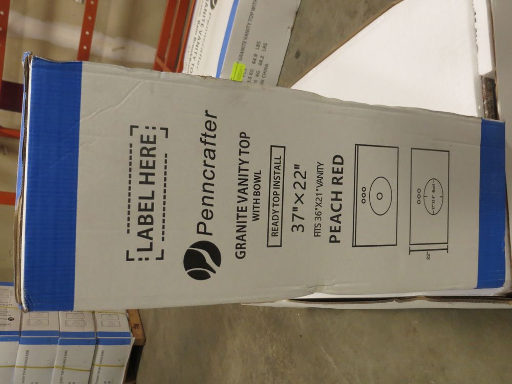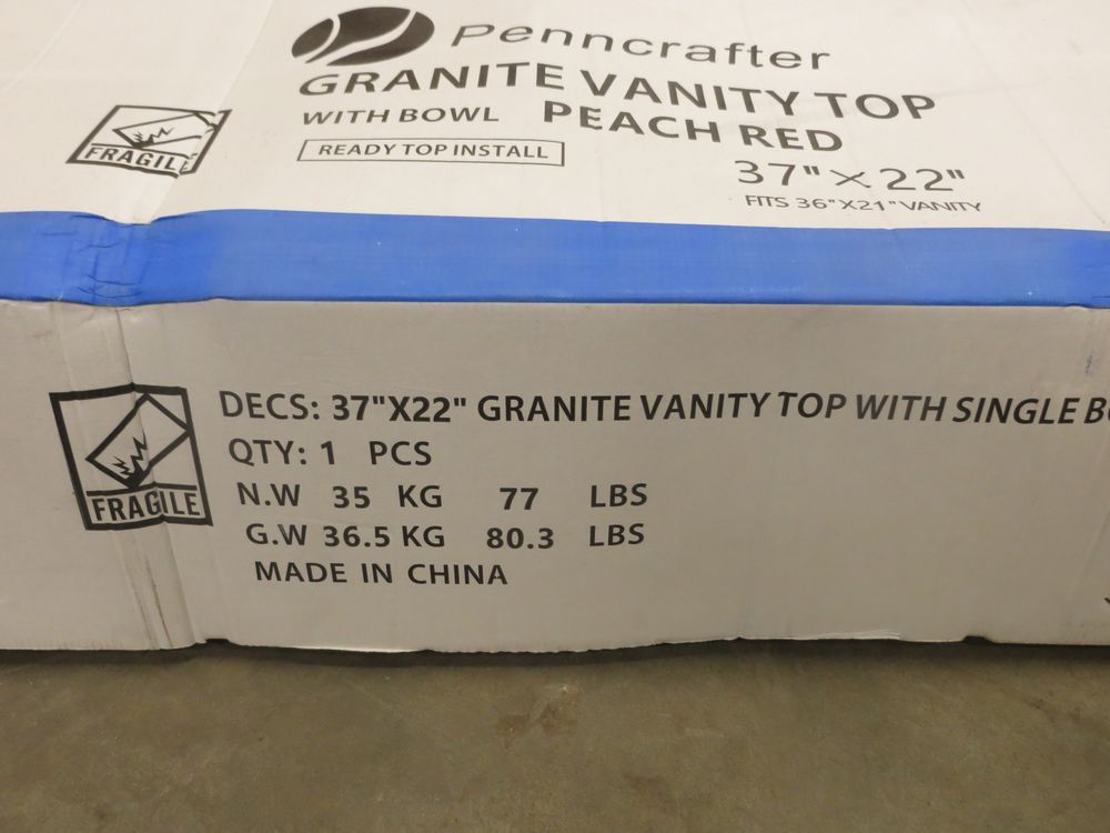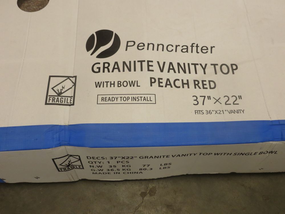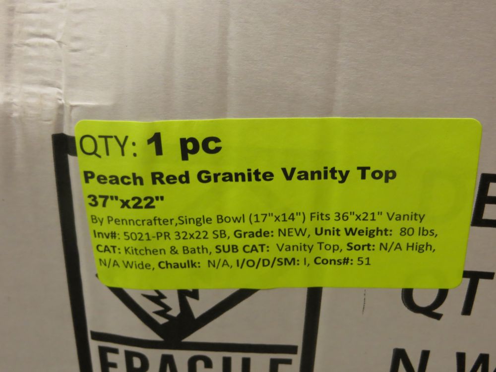 Peach Red Granite Vanity Top 37" x 22". By: Penncrafter, Single Bowl (17" x 14") Fits 36" x 21" Vanity. Grade: NEW *Any manufacturer warranties are NOT VALID with any purchase at our Auctions unless stated otherwise.. Weight: x. Sold by: Piece. Sold as: Quantity x Price.
