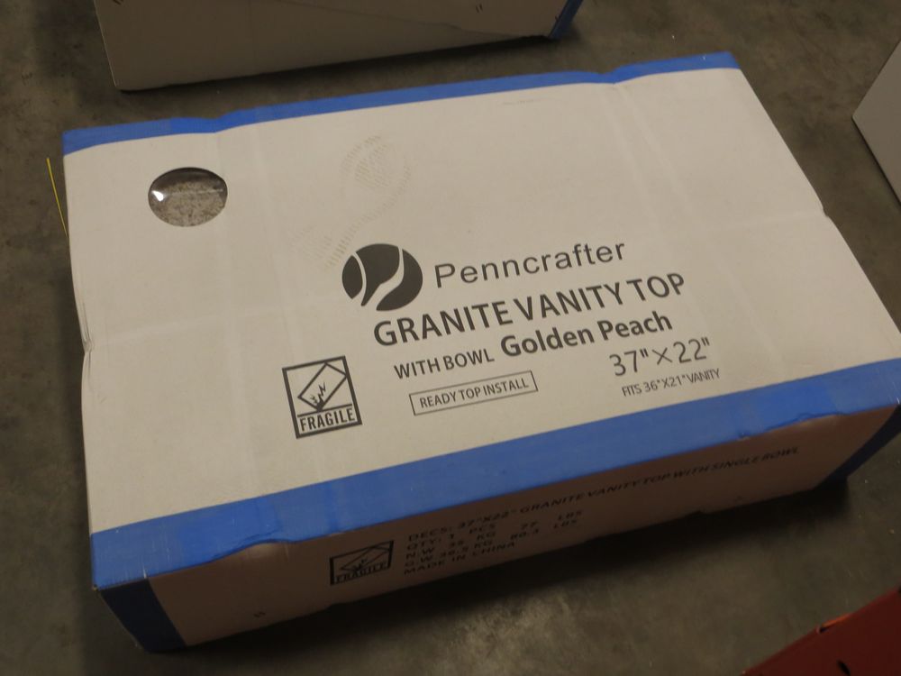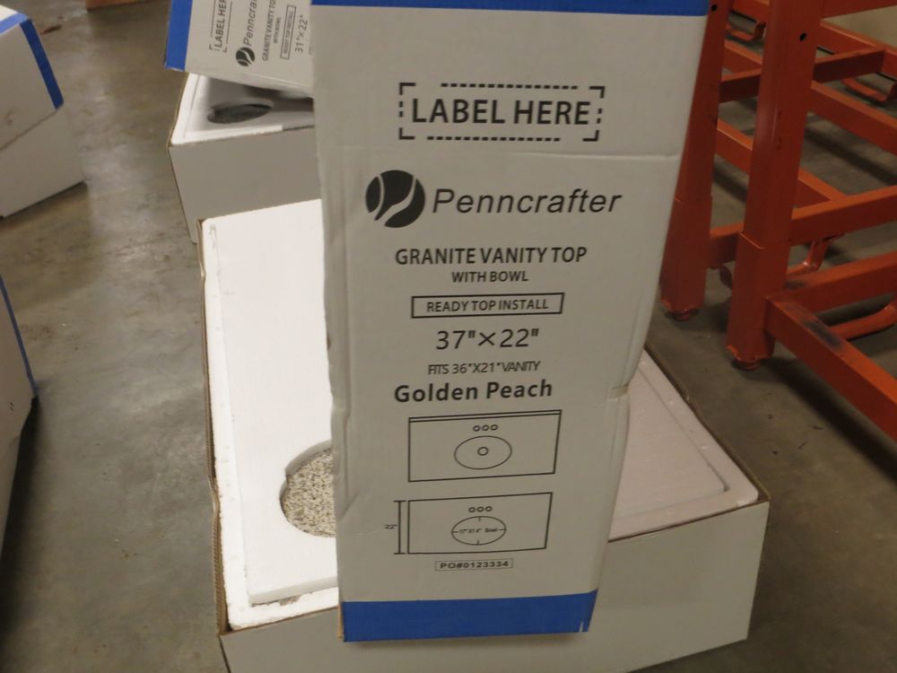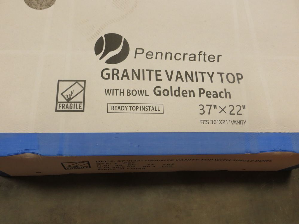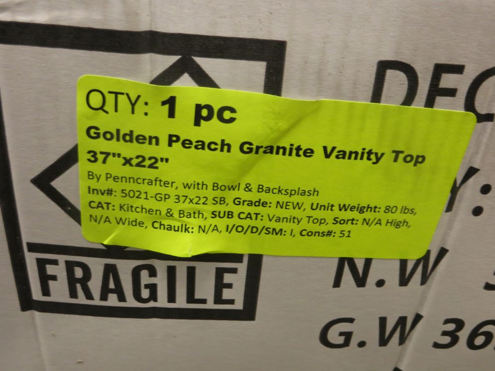 Golden Peach Granite Vanity Top 37" x 22". Penncrafter, with Bowl & Backsplash; Grade New *Any manufacturer warranties are NOT VALID with any purchase at our Auctions unless stated otherwise.. Weight: 80. Sold by: Piece. Sold as: Quantity x Price.