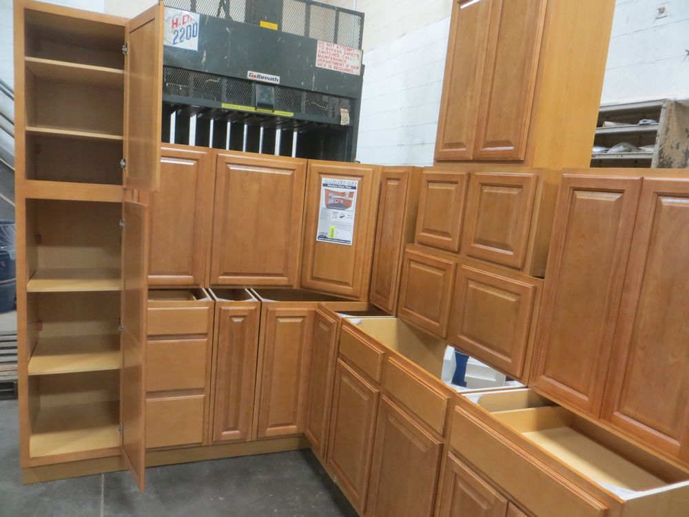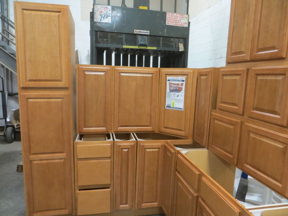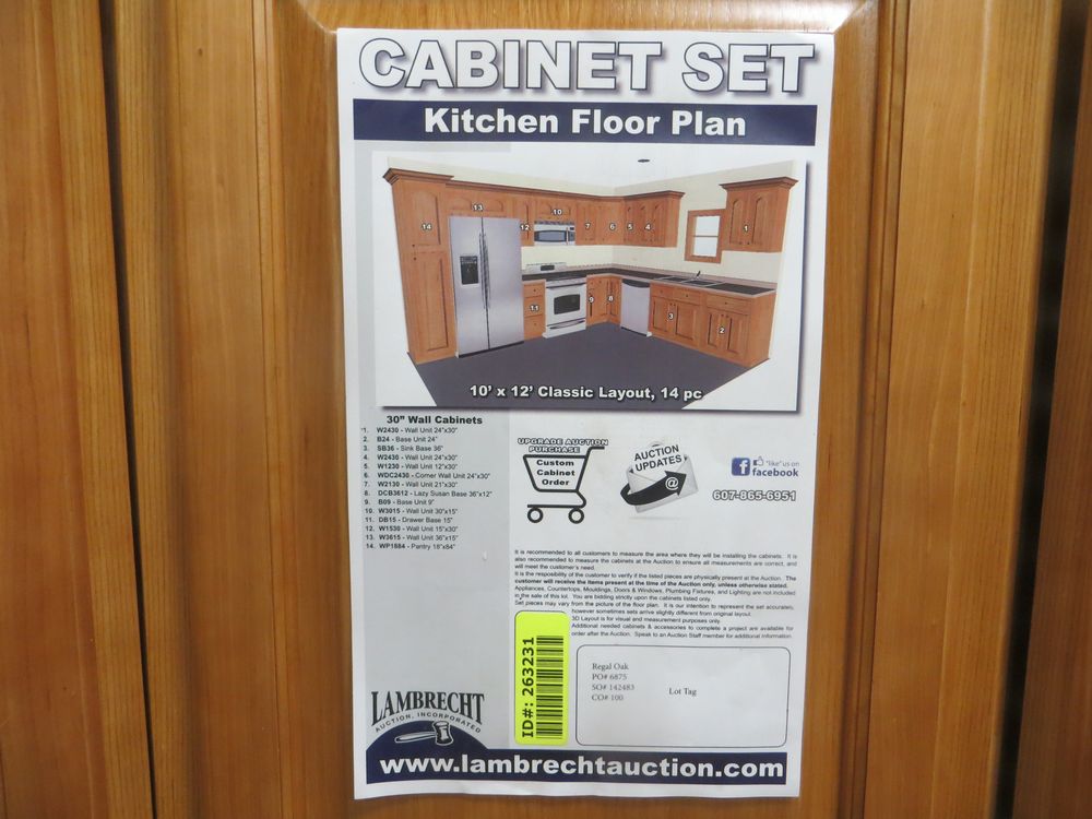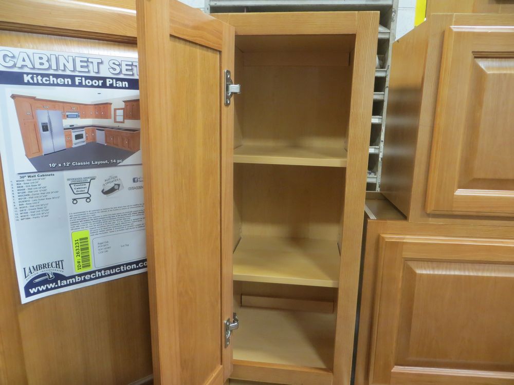 Regal Oak Kitchen Cabinet Set 10' x 12'. Classic Layout. 30" Walls. ASSEMBLY OPTION IS NOT AVAILABLE FOR THIS SET. By GHI, Additional pieces may be available for order to the high bidder. Additional cabinets ship boxed, ready to assemble. -All Wood Construction -3/4” Plywood with Veneer Oak Face Frame -Solid Oak Raised Panel Door with Veneer Center Panel -1/2” Plywood Box Construction -5/8” Plywood Shelf -Side Mount Glides and Plywood Drawer Box -Concealed Hinges -Additional Wall Cabinets Available in the Following Sizes; 30”, 36”, and 42”; if you would like a different size that what this cabinet is listed as please call our office at 607-865-6951 for a quote. Enclosed in each cabinet set will be a Build Sheet which lists the individual cabinets in each set. As the cabinets are palletized each cabinet will be checked off and signed by our staff member to ensure that the set is complete at the time of pick-up. Please keep this Build Sheet on hand because it will be required if there is an issue with your cabinet set. Cabinet issues will not be addressed without this build sheet. *Any manufacturer warranties are NOT VALID with any purchase at our Auctions unless stated otherwise.. Weight: X. Sold by: Set. Sold as: Quantity x Price.