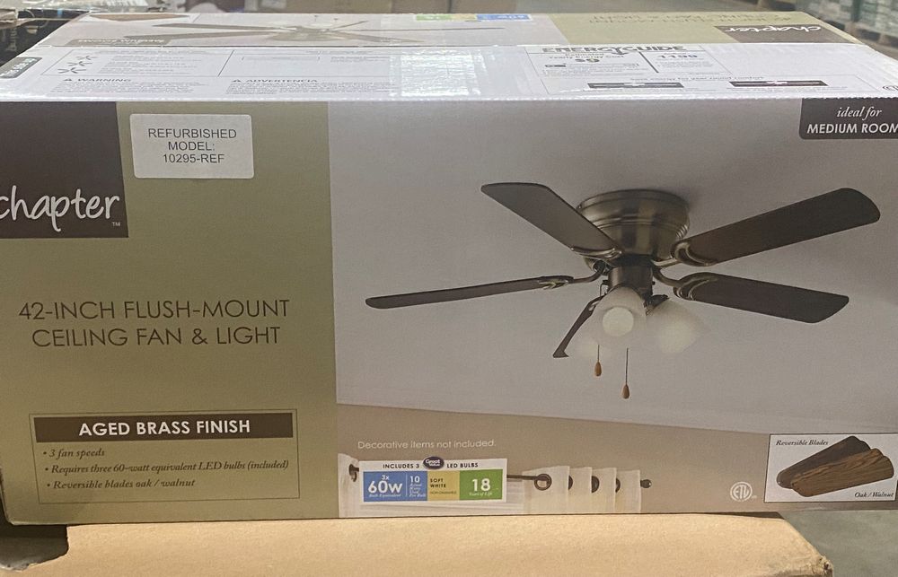 Aged Brass Tri-Mount Ceiling Fan & 3pc Light 42". 17 Speed Motor, 3 60W LED bulbs Included, Reversable Blades Oak or Walnut Finish. Grade: Refurbished *Any manufacturer warranties are NOT VALID with any purchase at our Auctions unless stated otherwise.. Weight: 15 lbs.. Sold by: Piece. Sold as: Quantity x Price.