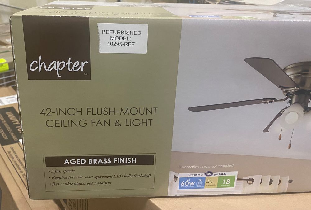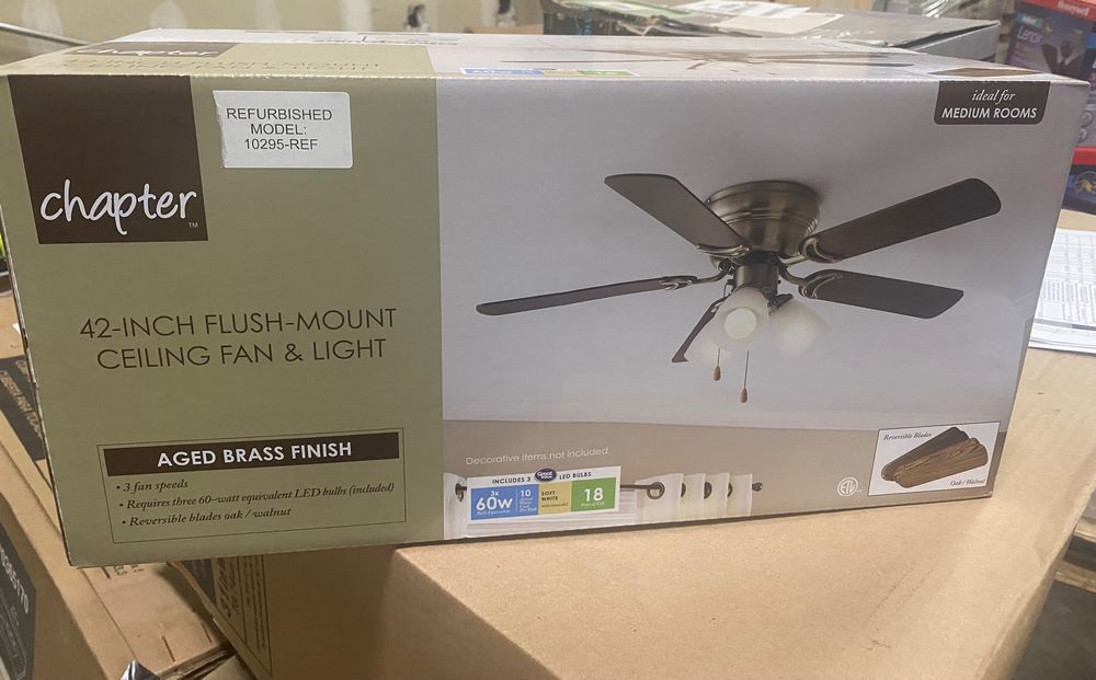 Aged Brass Tri-Mount Ceiling Fan & 3pc Light 42". 18 Speed Motor, 3 60W LED bulbs Included, Reversable Blades Oak or Walnut Finish. Grade: Refurbished *Any manufacturer warranties are NOT VALID with any purchase at our Auctions unless stated otherwise.. Weight: 15 lbs.. Sold by: Piece. Sold as: Quantity x Price.