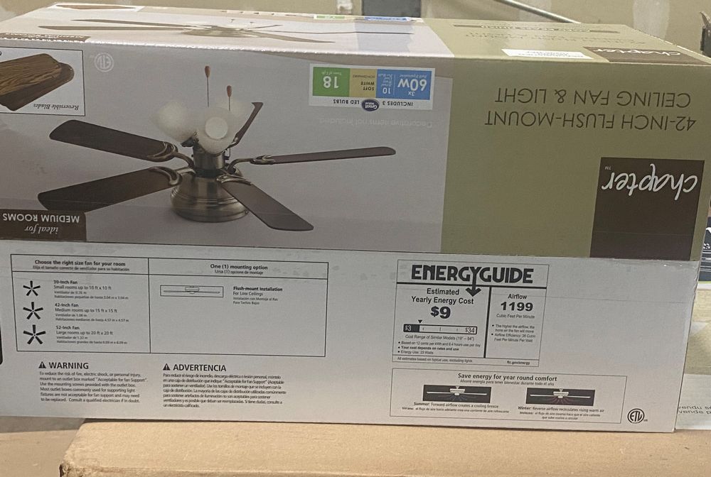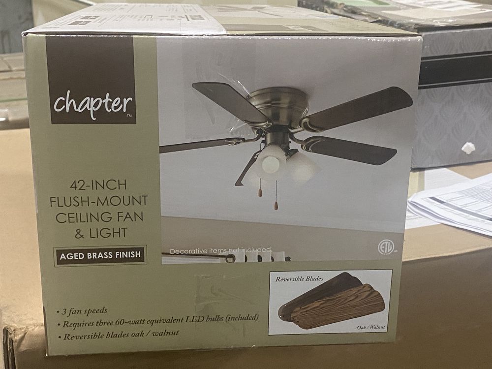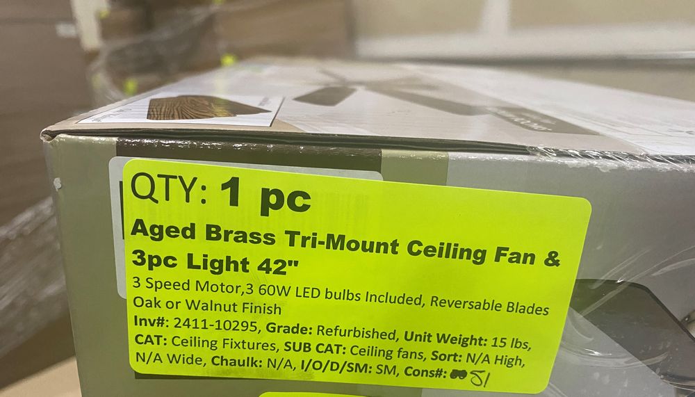 Aged Brass Tri-Mount Ceiling Fan & 3pc Light 42". 19 Speed Motor, 3 60W LED bulbs Included, Reversable Blades Oak or Walnut Finish. Grade: Refurbished *Any manufacturer warranties are NOT VALID with any purchase at our Auctions unless stated otherwise.. Weight: 15 lbs.. Sold by: Piece. Sold as: Quantity x Price.