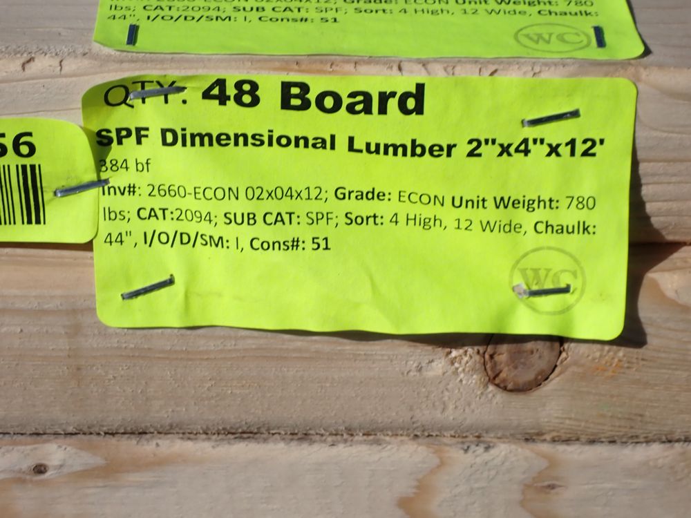 SPF Dimensional Lumber 2" x 4" x 12'. 384 bf. Grade: ECON. *Any manufacturer warranties are NOT VALID with any purchase at our Auctions unless stated otherwise.. Weight: 780. Sold by: Board. Sold as: Quantity x Price.