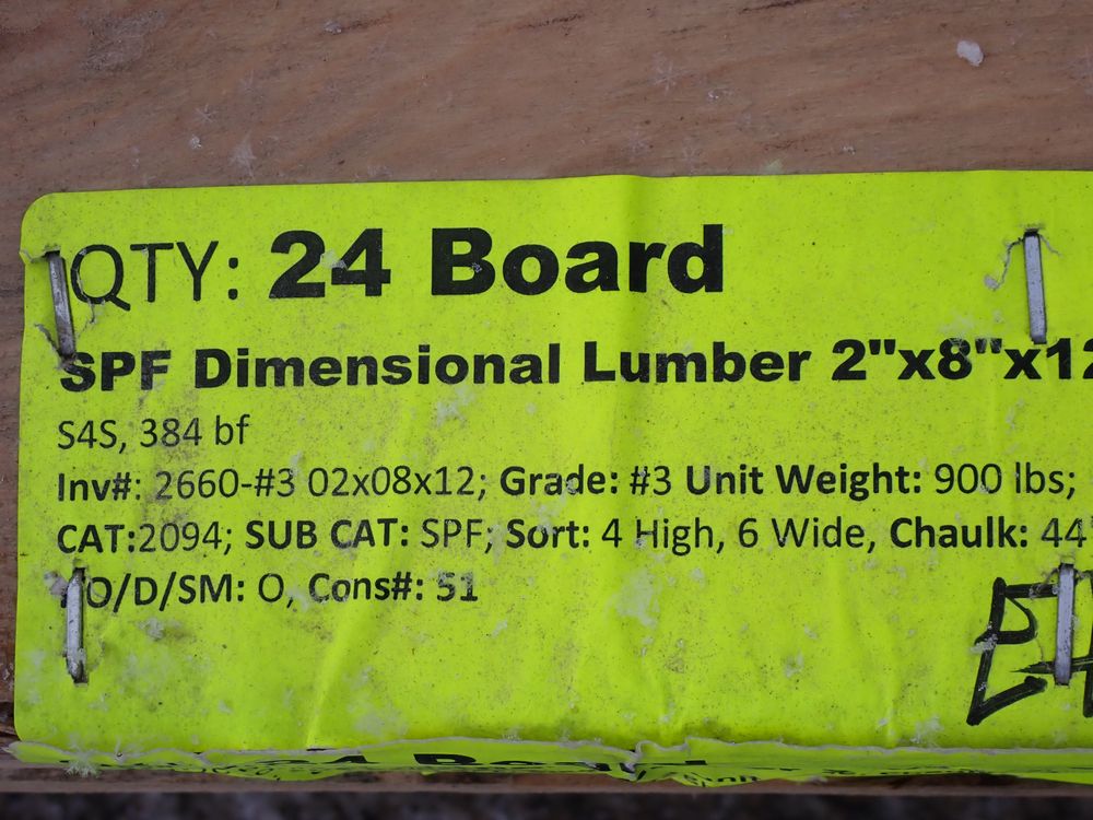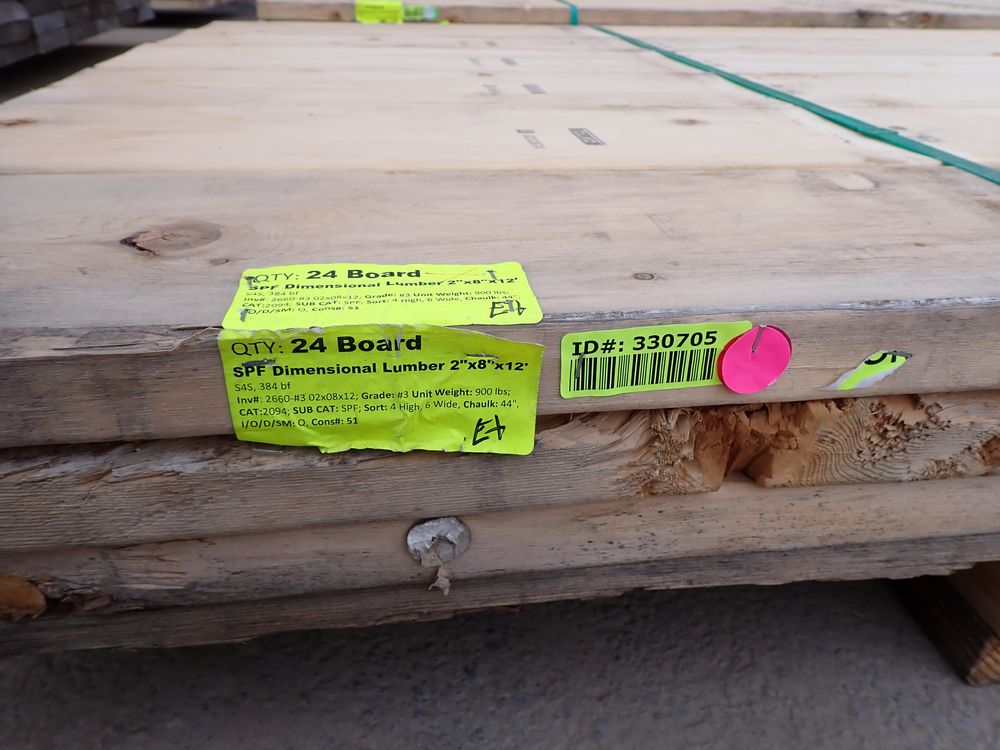SPF Dimensional Lumber 2" x 8" x 12' *See Description*. S4S, 384 bf. Grade: #3. *Weathered, Light mold* *Any manufacturer warranties are NOT VALID with any purchase at our Auctions unless stated otherwise.. Weight: 900. Sold by: Board. Sold as: Quantity x Price.