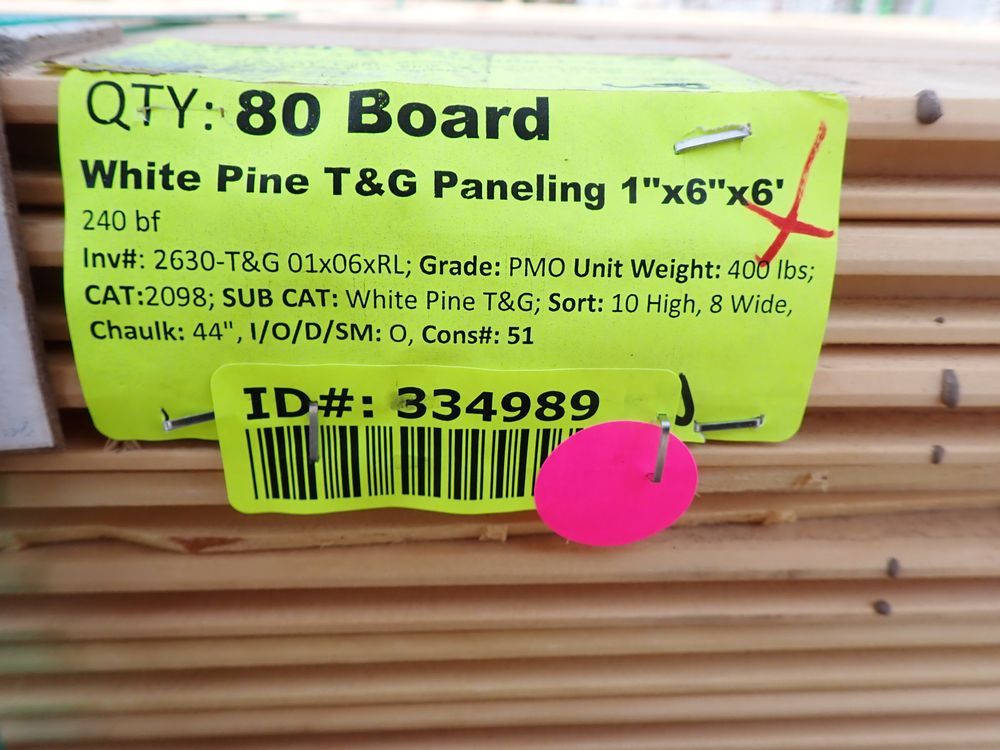 White Pine T&G Paneling 1" x 6" x 6'. 240 bf, Grade: PMO Face Side Has All Edge And Center Bead, Back Of Board Profile Varies *Any manufacturer warranties are NOT VALID with any purchase at our Auctions unless stated otherwise.. Weight: 400. Sold by: Board. Sold as: Quantity x Price.