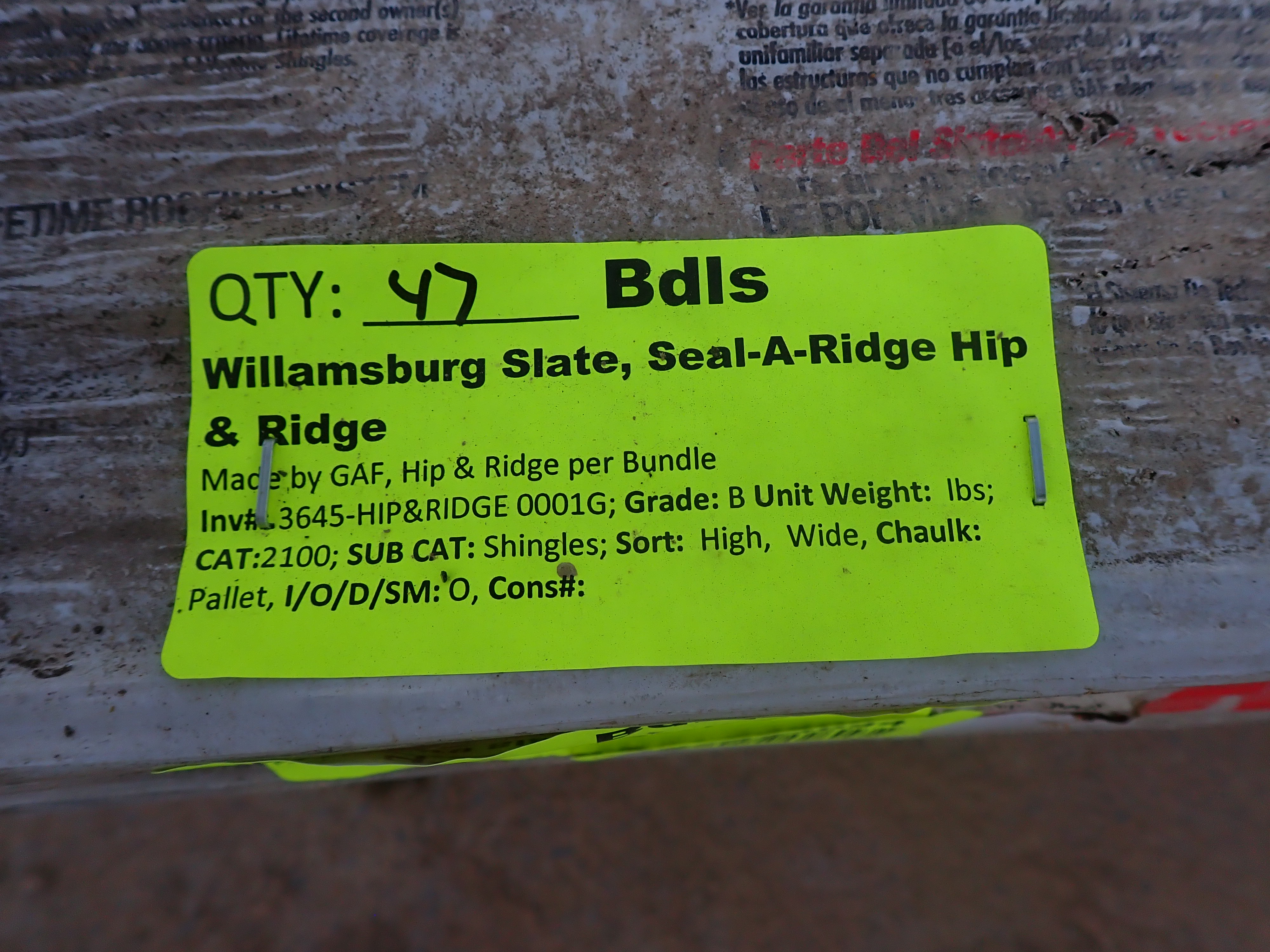 Williamsburg Slate, Seal-A-Ridge Hip & Ridge. Made By: GAF, HIP & Ridge, Per Bundle *Any manufacturer warranties are NOT VALID with any purchase at our Auctions unless stated otherwise.. Weight: X. Sold by: Square. Sold as: Quantity x Price.
