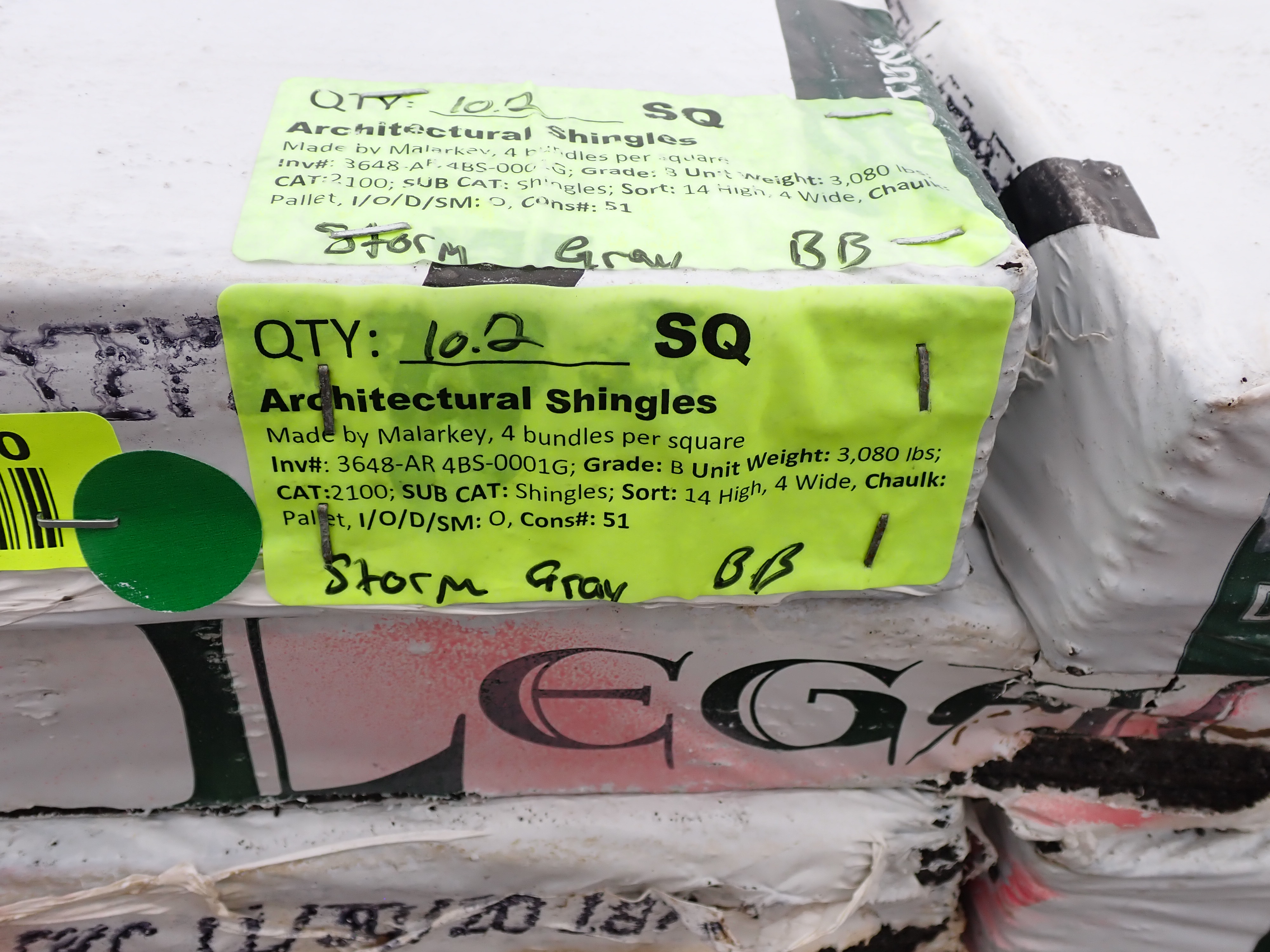 10.2 SQ of Storm Gray Architectural Shingles. Made By: Marlakey. 4 Bundles Per Square. Grade: B *Any manufacturer warranties are NOT VALID with any purchase at our Auctions unless stated otherwise.. Weight: 3080. Sold by: Square. Sold as: Quantity x Price.