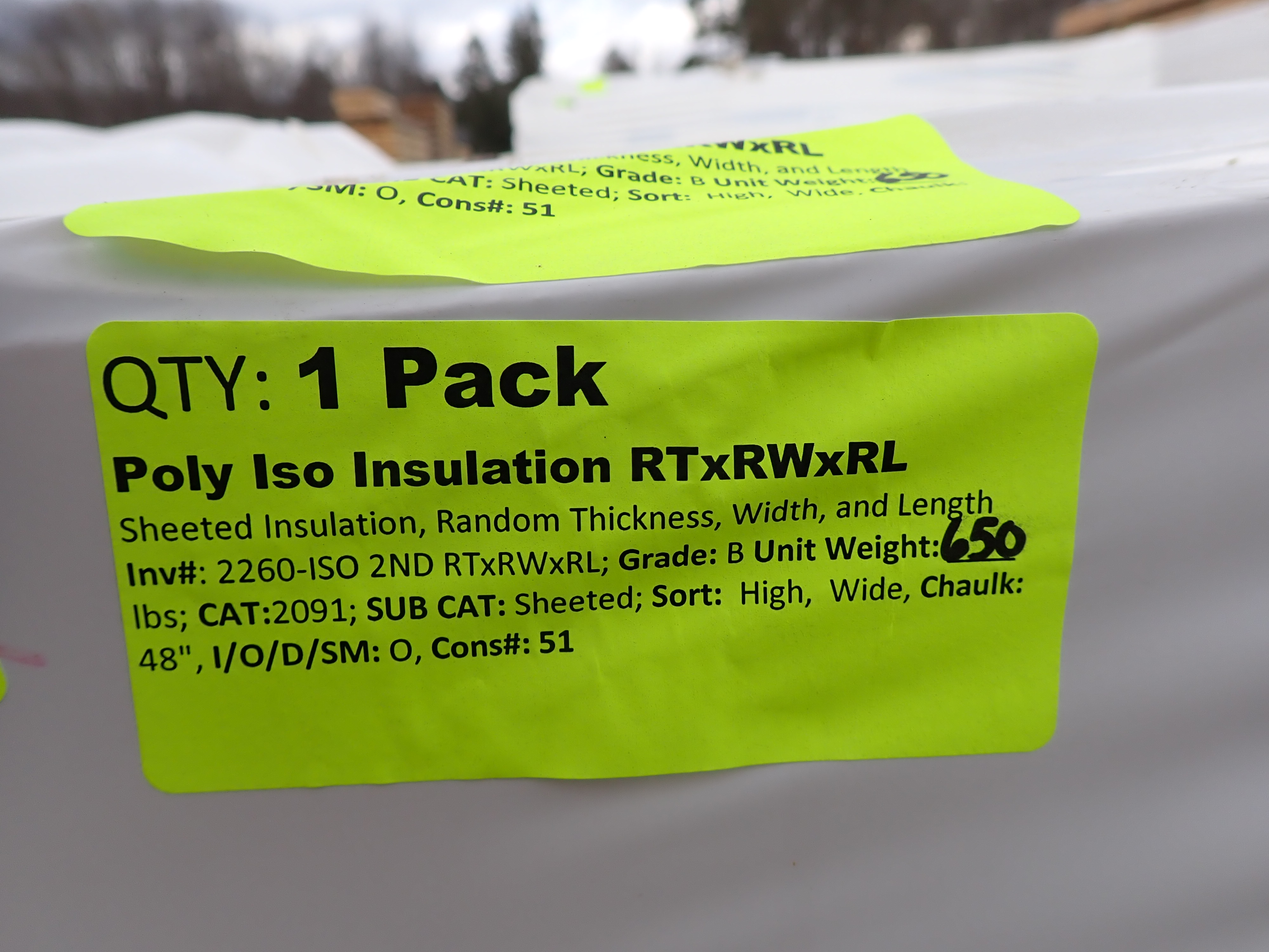 Poly Iso Insulation RT x RW x RL. Sheeted Insulation, Random Thickness, Random Width, and Length. Grade: B *Any manufacturer warranties are NOT VALID with any purchase at our Auctions unless stated otherwise.. Weight: 650. Sold by: Pack. Sold as: Quantity x Price.