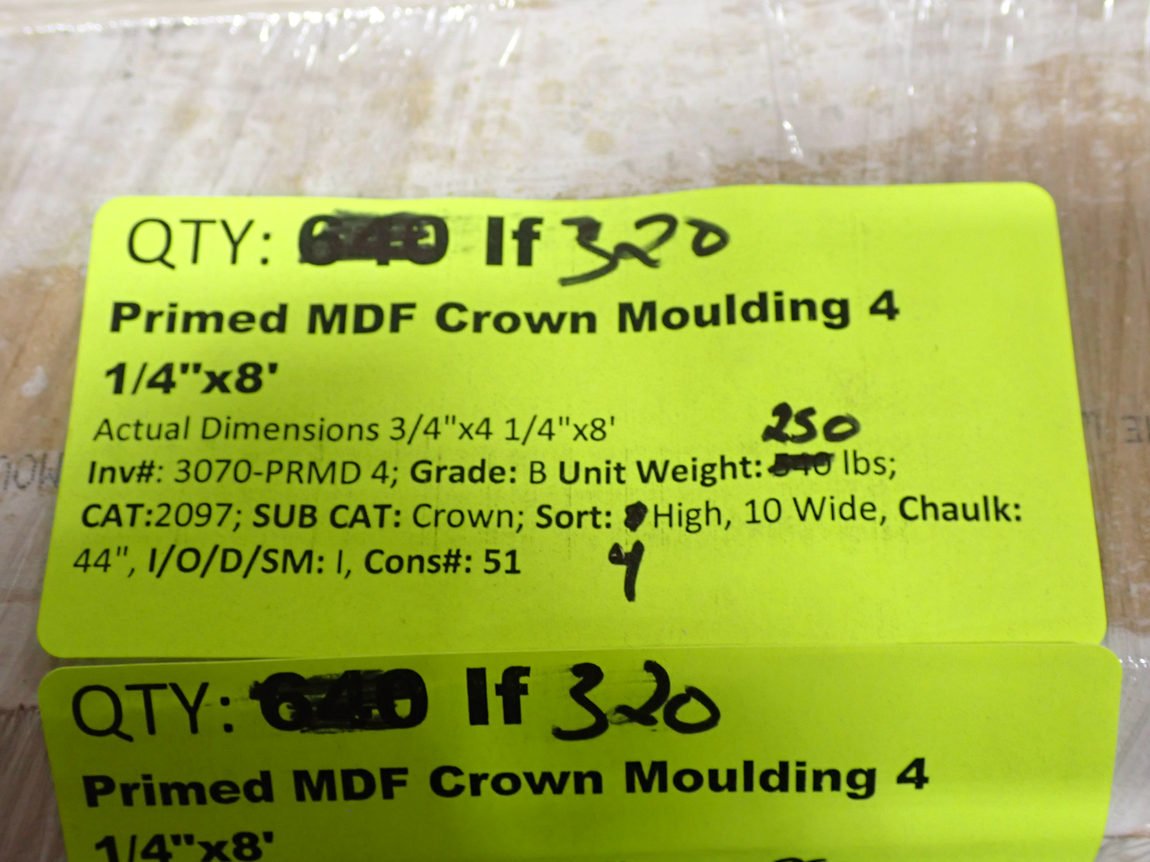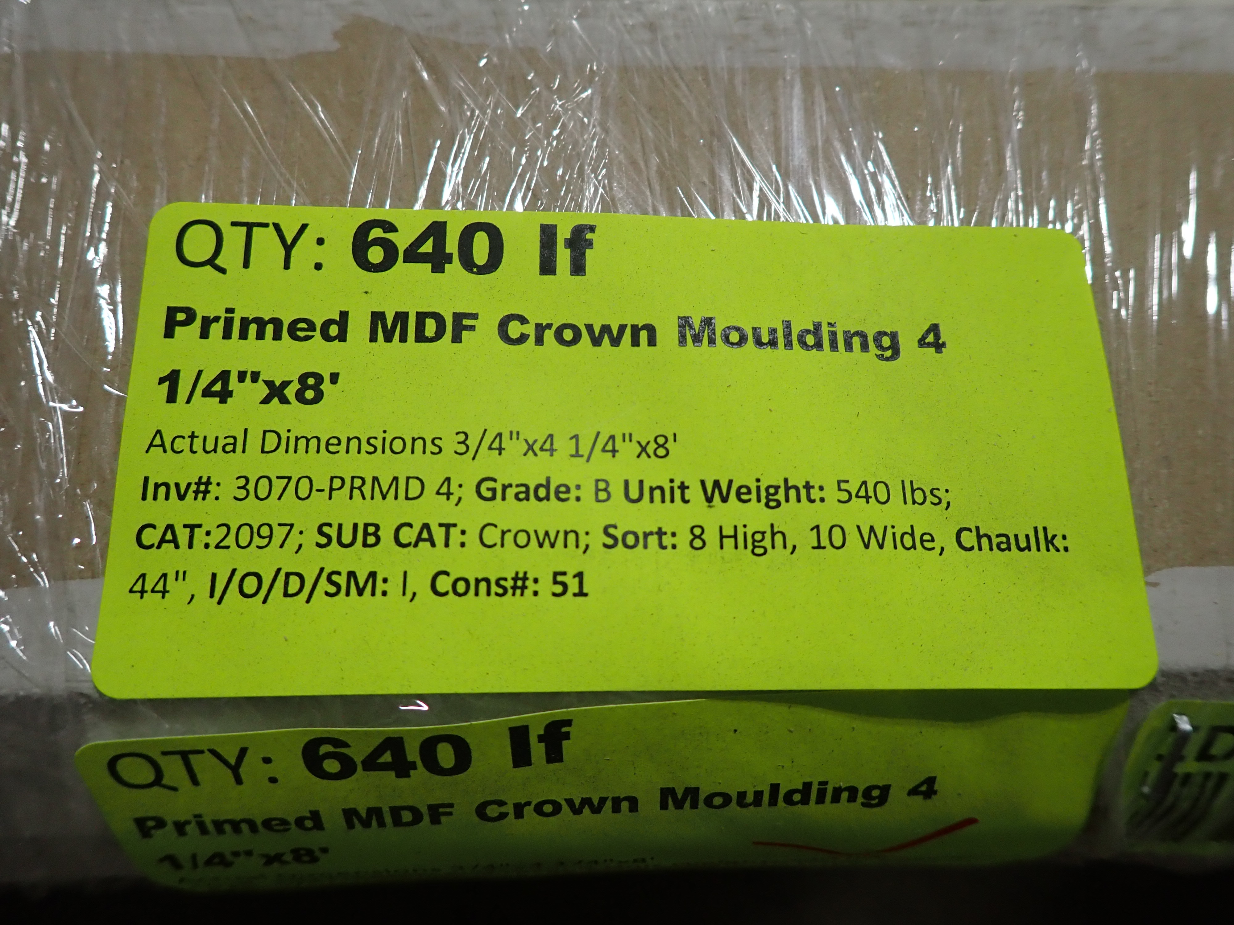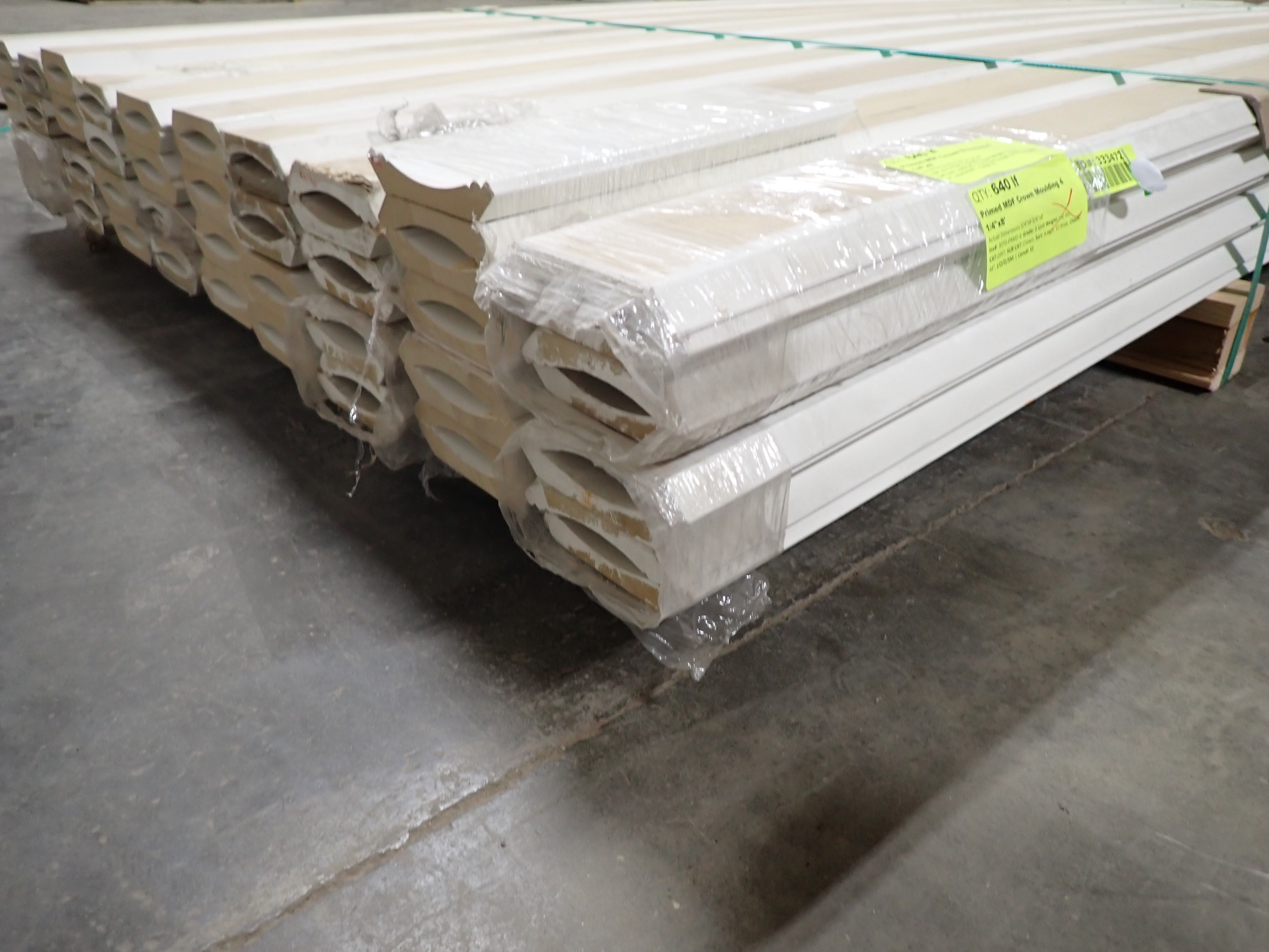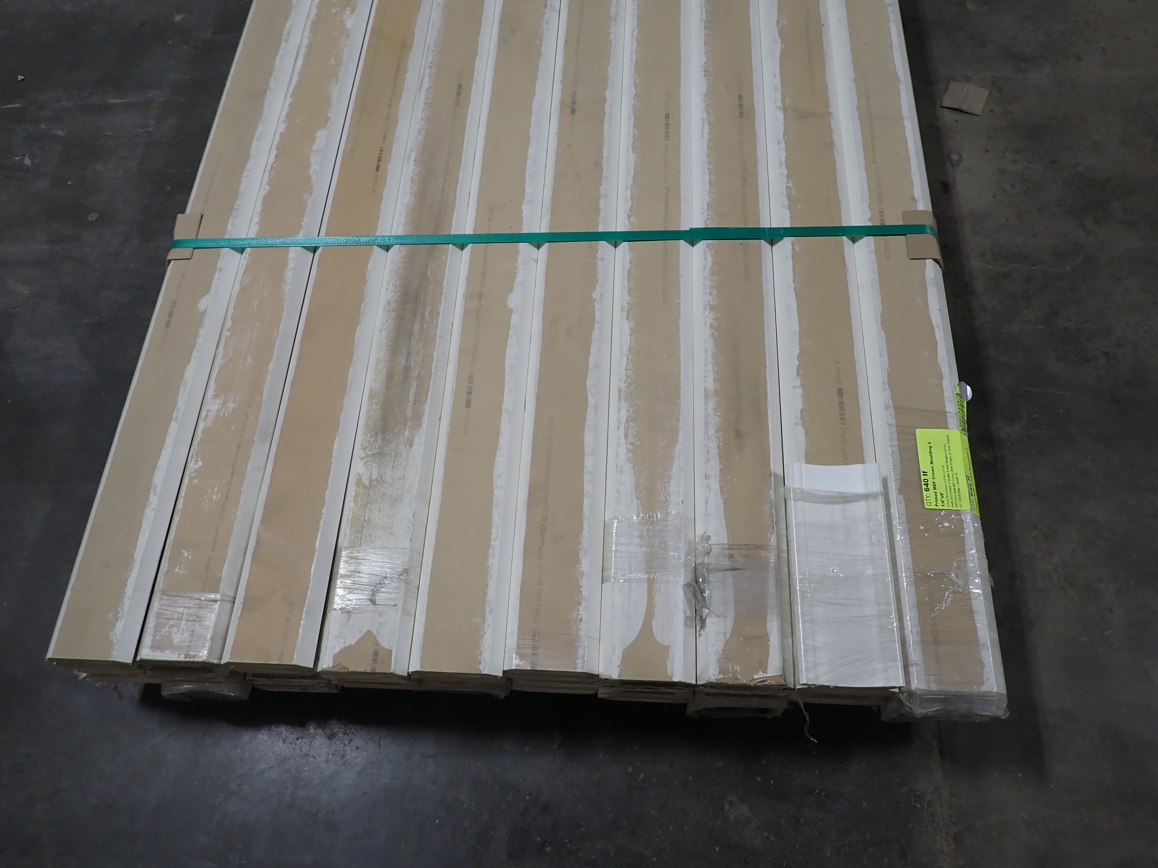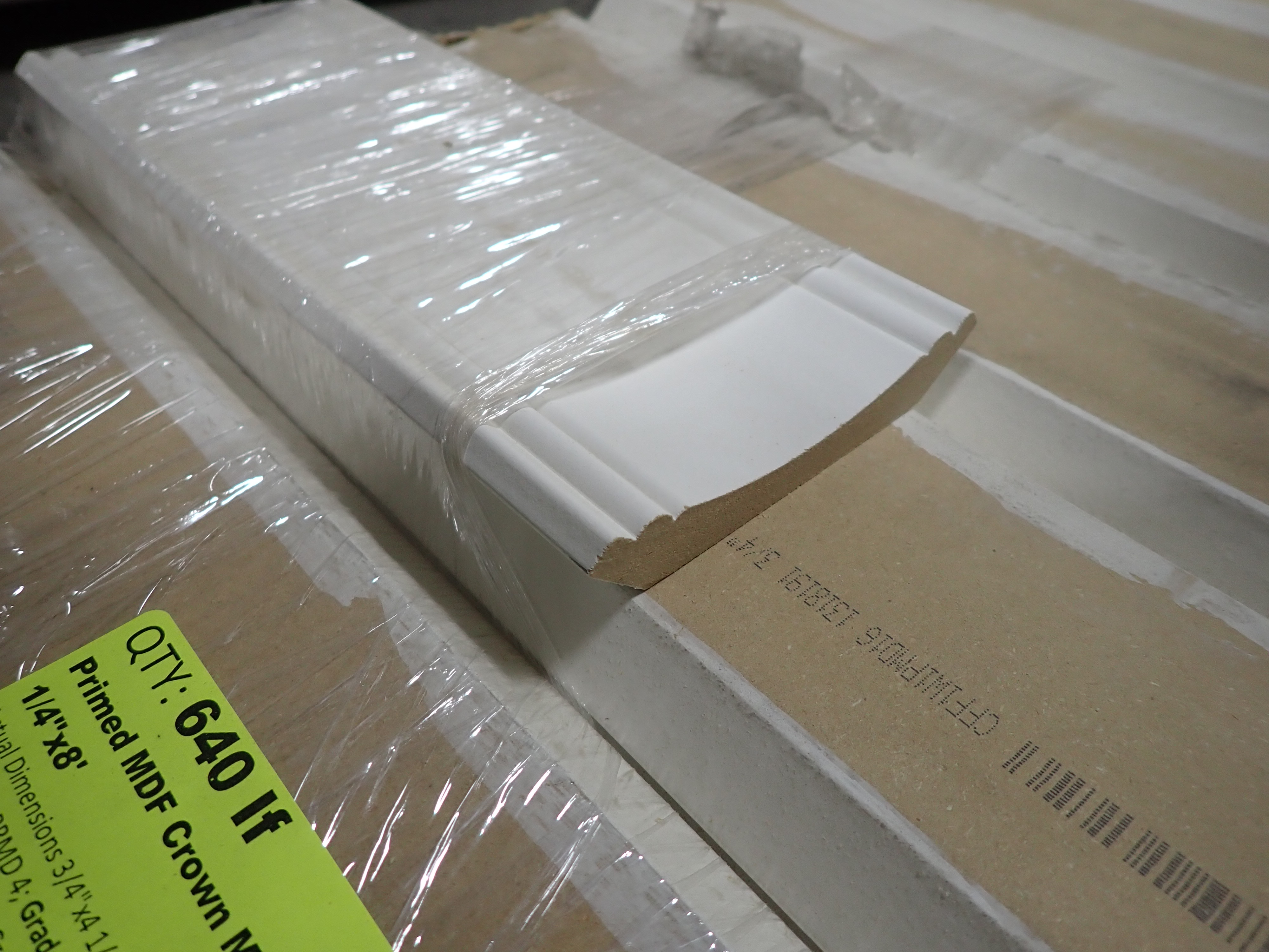 Primed MDF Crown Molding 4 1/4" x 8'. Actual Dimensions; 3/4" x 4 1/4", 8' *Any manufacturer warranties are NOT VALID with any purchase at our Auctions unless stated otherwise.. Weight: 540. Sold by: Linear Foot. Sold as: Quantity x Price.