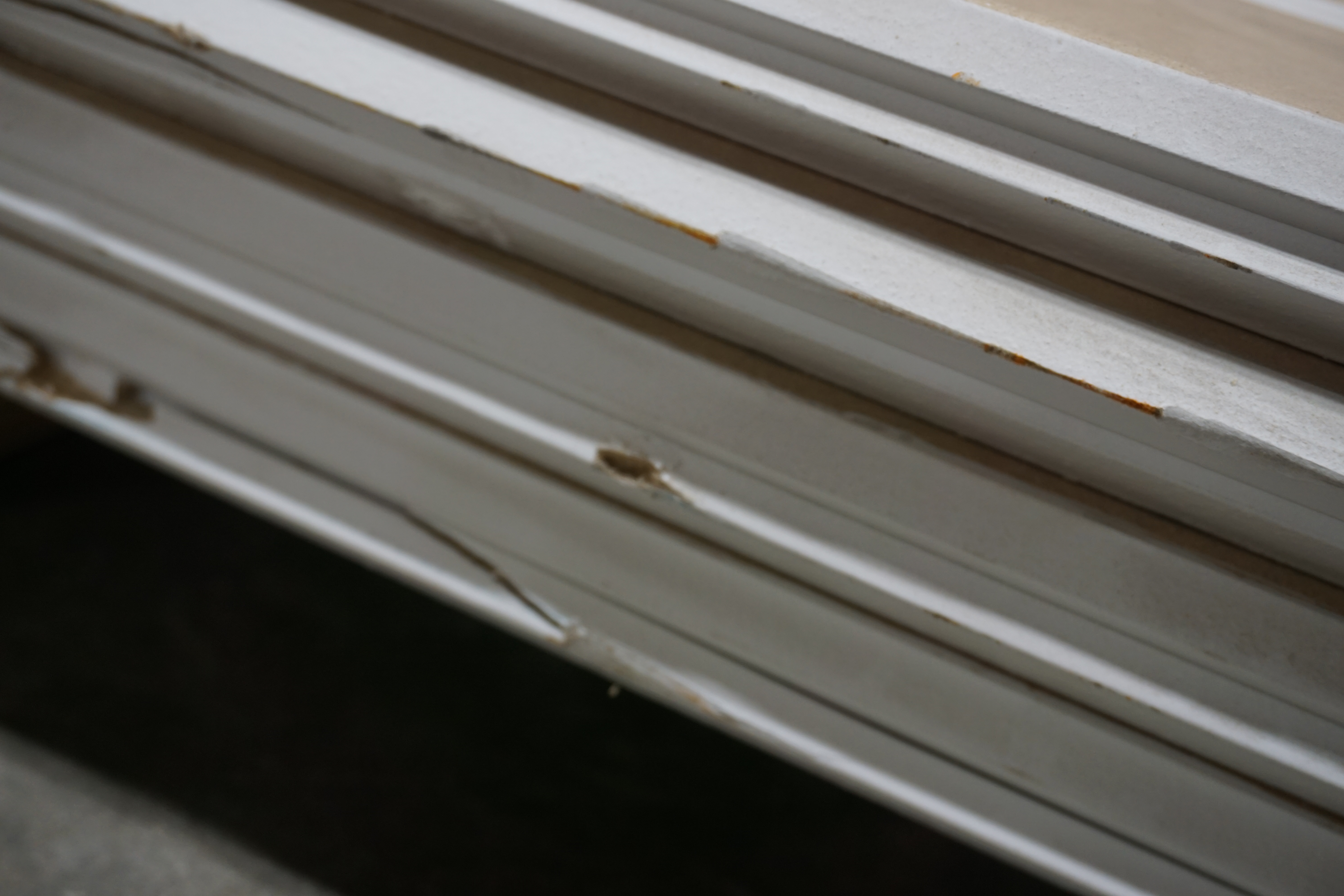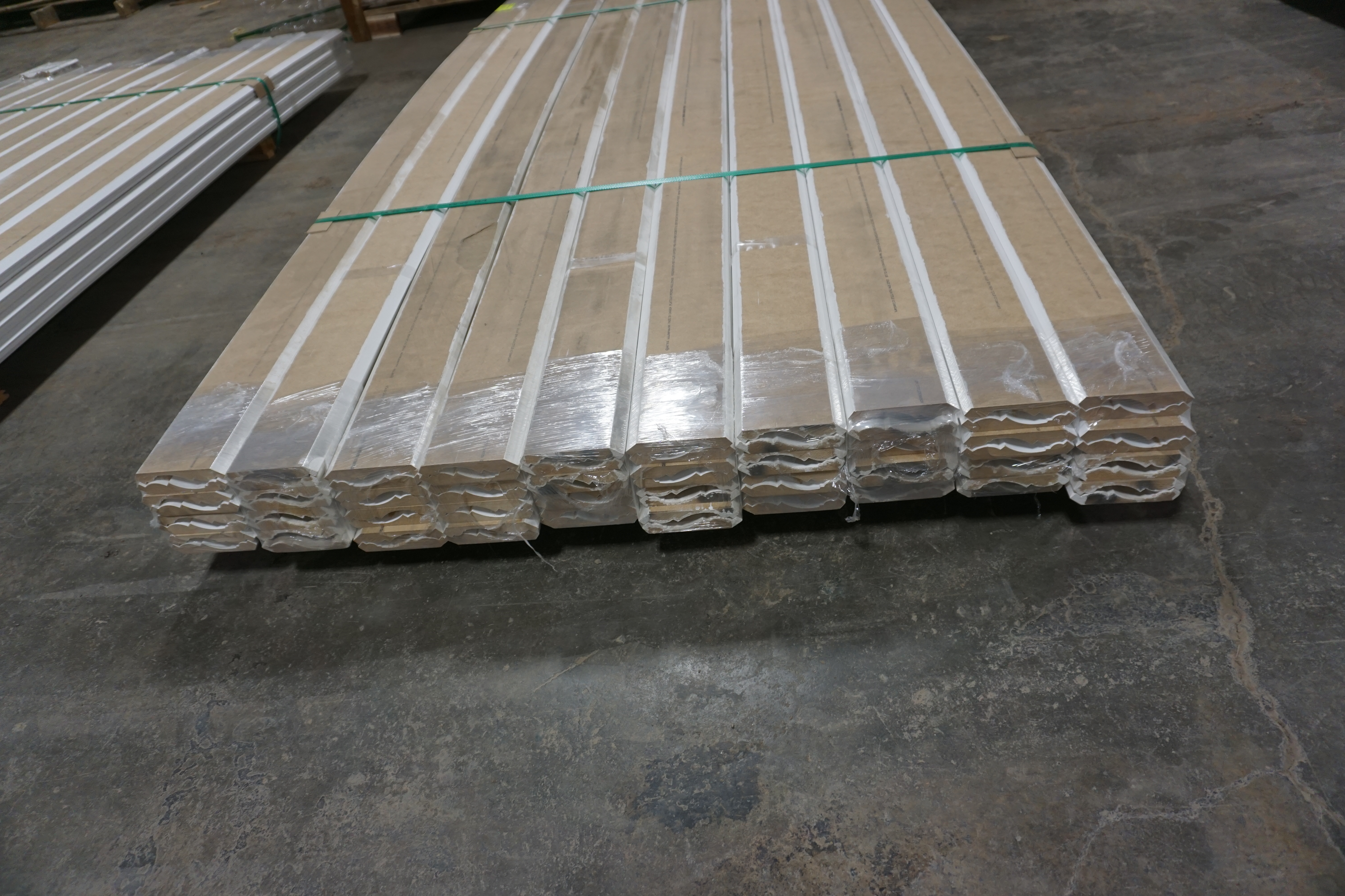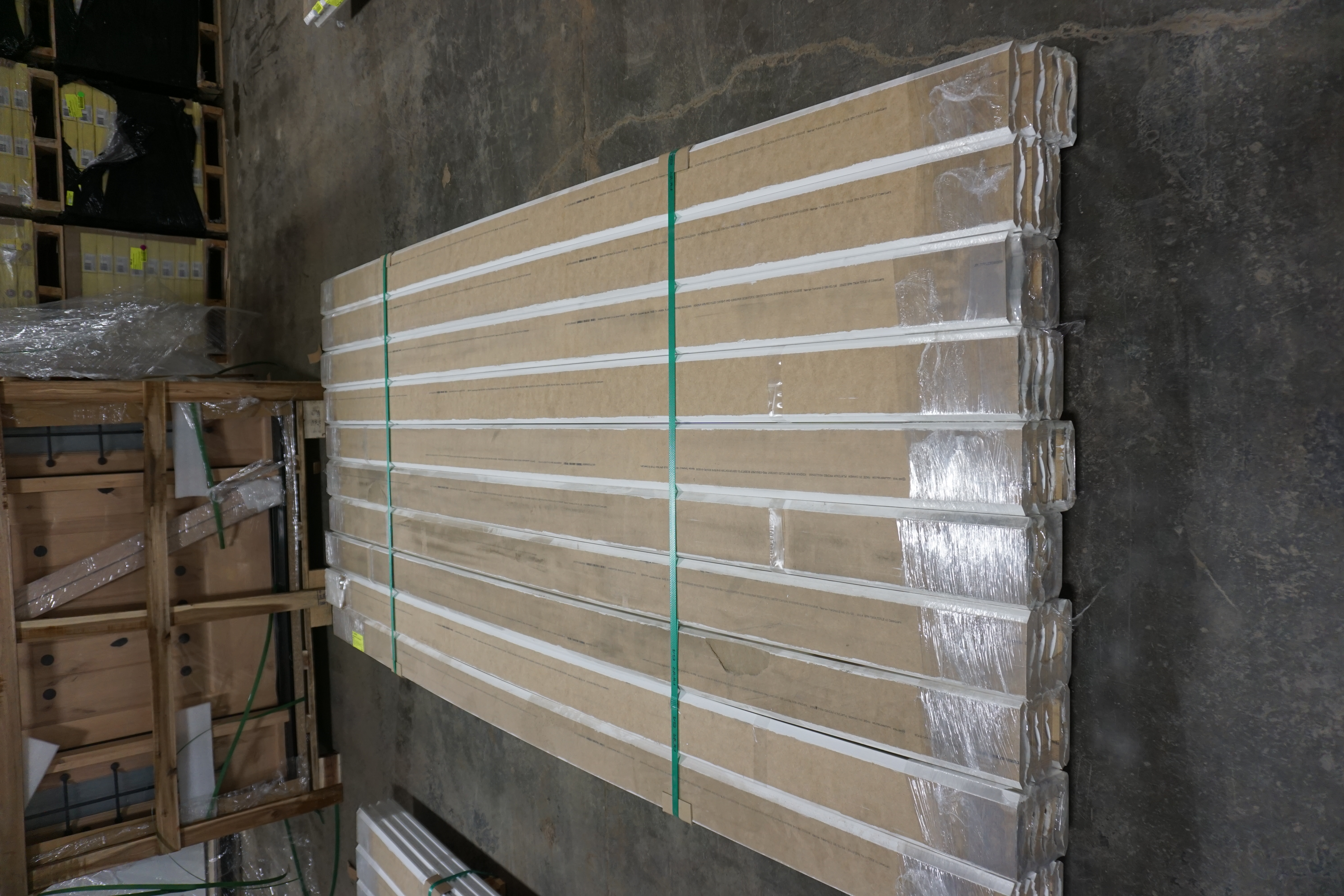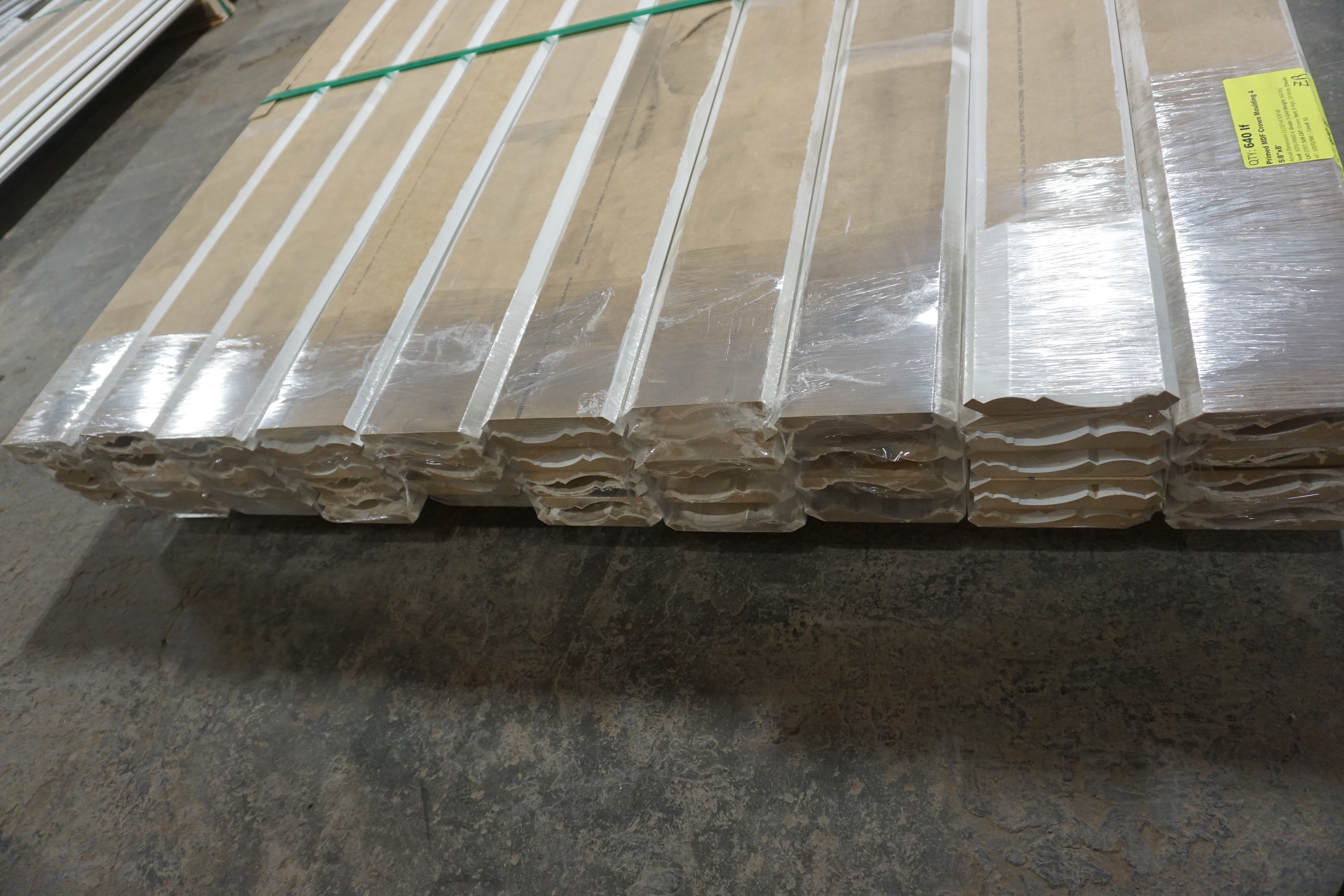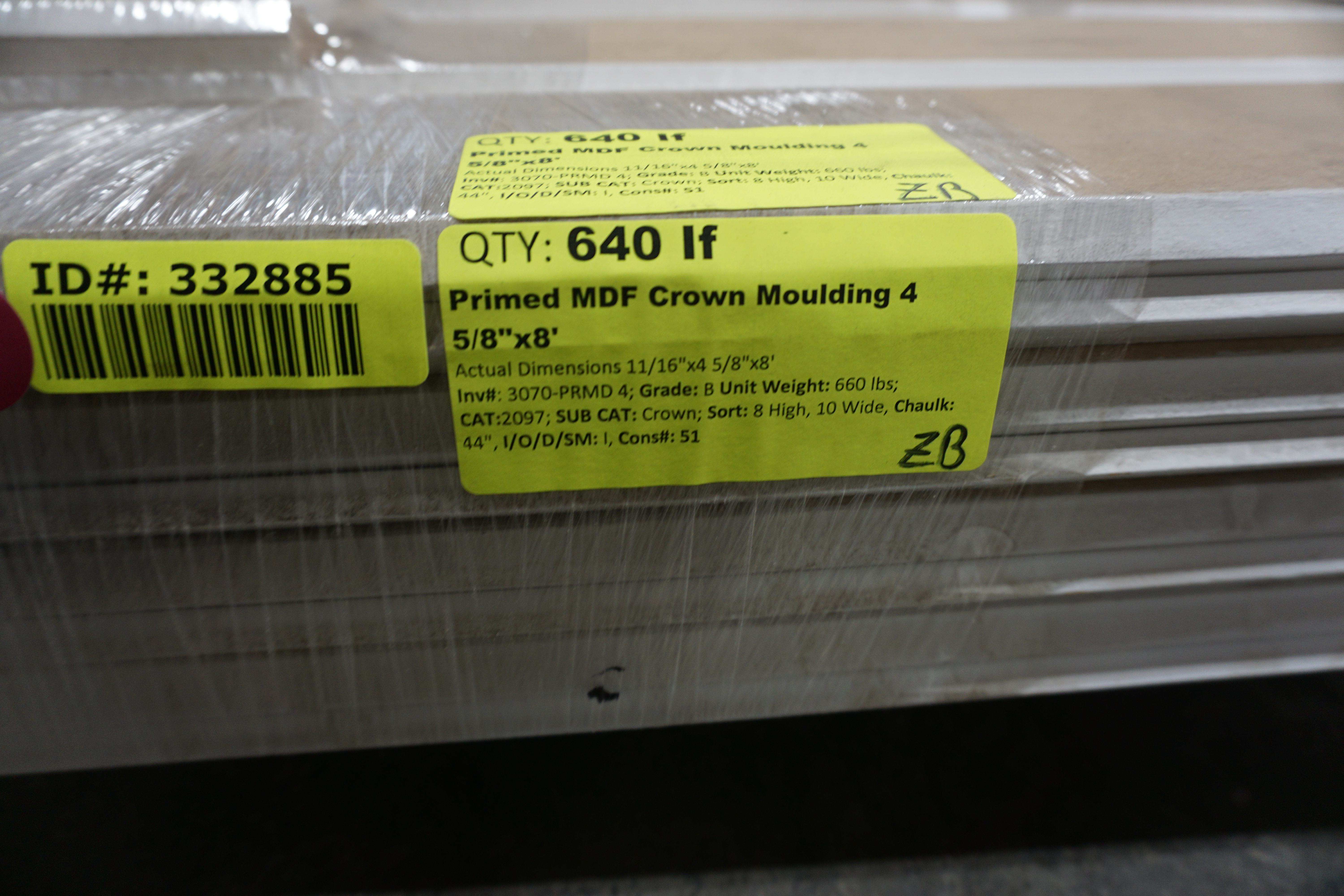 Primed MDF Crown Moulding 4 5/8" x 8' *SEE DESCRIPTION*. Actual Dimensions: 11/16" x 4 5/8" x8'. Grade: B. 80 Pieces. *Please pay attention to photos. Some boards have slight damage.* *Any manufacturer warranties are NOT VALID with any purchase at our Auctions unless stated otherwise.. Weight: 660. Sold by: Linear Foot. Sold as: Quantity x Price.