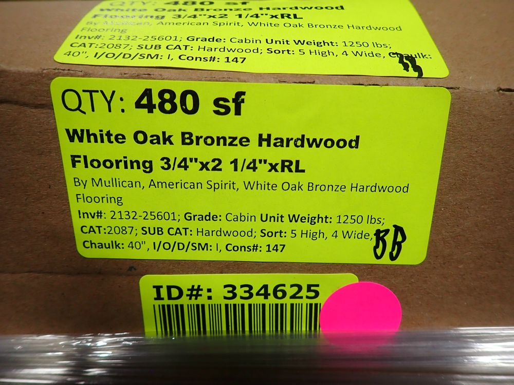 White Oak Bronze Hardwood Flooring 3/4" x 1/4" x RL. By Mullican, American Spirit, White Oak Bronze Hardwood Flooring, Grade: Cabin, 20 Boxes, 24 SF Per Box. *Any manufacturer warranties are NOT VALID with any purchase at our Auctions unless stated otherwise.. Weight: 1250. Sold by: Square Foot. Sold as: Quantity x Price.