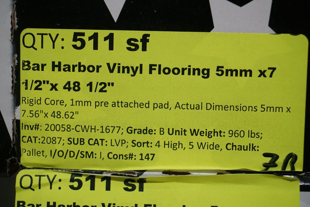 Bar Harbor Vinyl Flooring 5mm x 7 1/2" x48 1/2". Rigid Core, 1mm Pre Attached Pad, Actual Dimensions 5mm x 7.56" x 48.62". 20 Boxes, 25.5 Square Foot in each box. Grade B. *Any manufacturer warranties are NOT VALID with any purchase at our Auctions unless stated otherwise.. Weight: . Sold by: Square Foot. Sold as: Quantity x Price.
