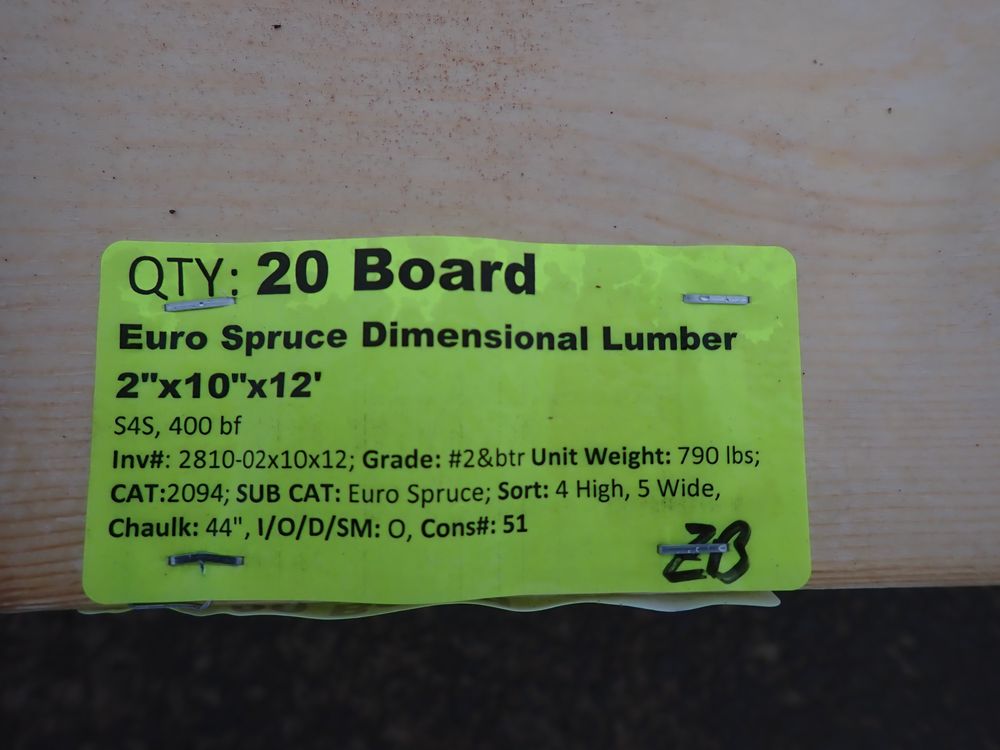 Euro Spruce Dimensional Lumber 2" x 10" x 12'. S4S, bf, Grade #2&btr *Any manufacturer warranties are NOT VALID with any purchase at our Auctions unless stated otherwise.. Weight: 790. Sold by: Board. Sold as: Quantity x Price.