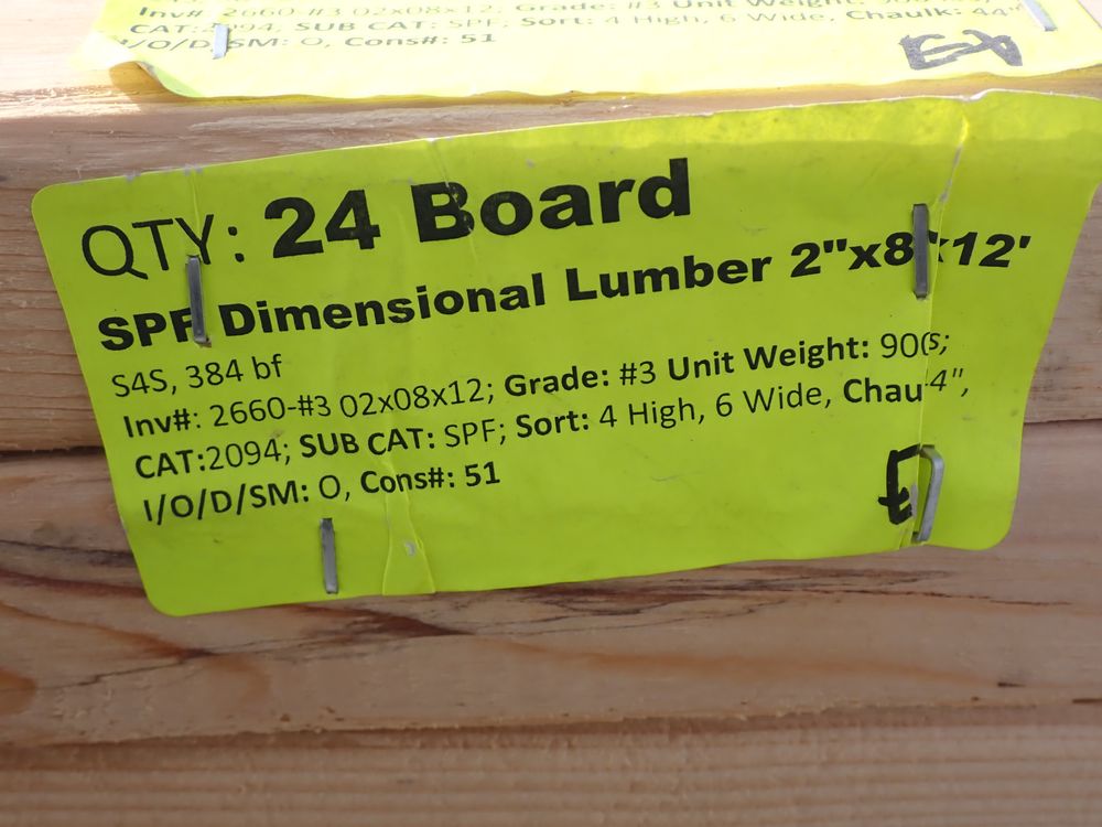 SPF Dimensional Lumber 2" x 8" x 12'. S4S, 384 bf, Grade: #3 *Any manufacturer warranties are NOT VALID with any purchase at our Auctions unless stated otherwise.. Weight: 900. Sold by: Board. Sold as: Quantity x Price.